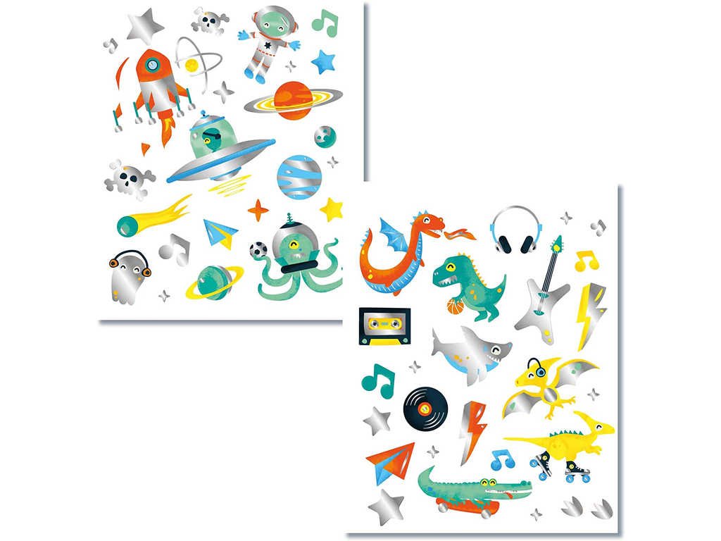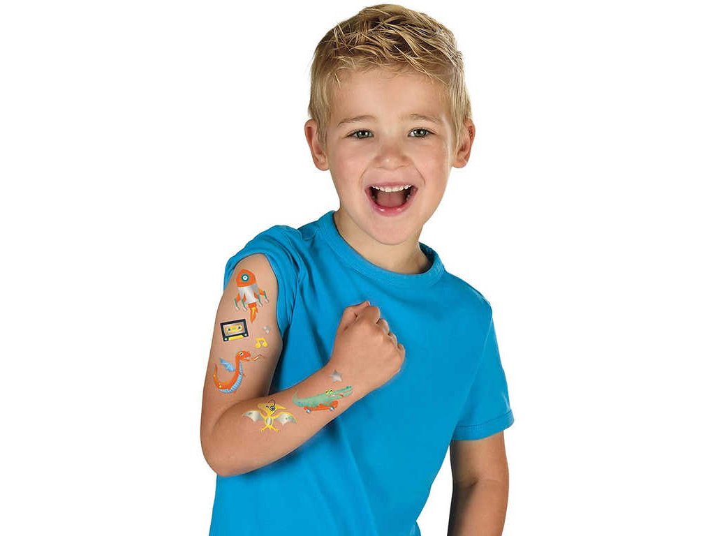 chvilky vytvořit tetování draka, žraloka, sluchátek, rakety, prostě tetování, které ocení správní kluci. Stačí vybraný obrázek vystřihnout, přiložit na kůži, potřít vodou a opatrně nosnou fólii odstranit. Tetování je pro