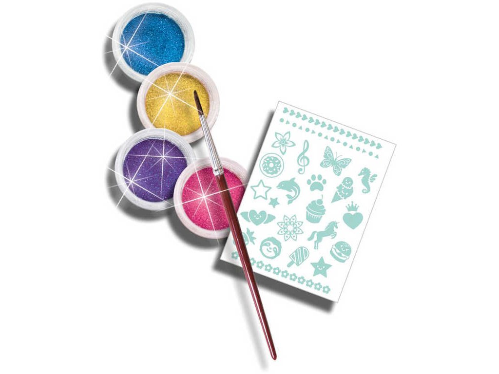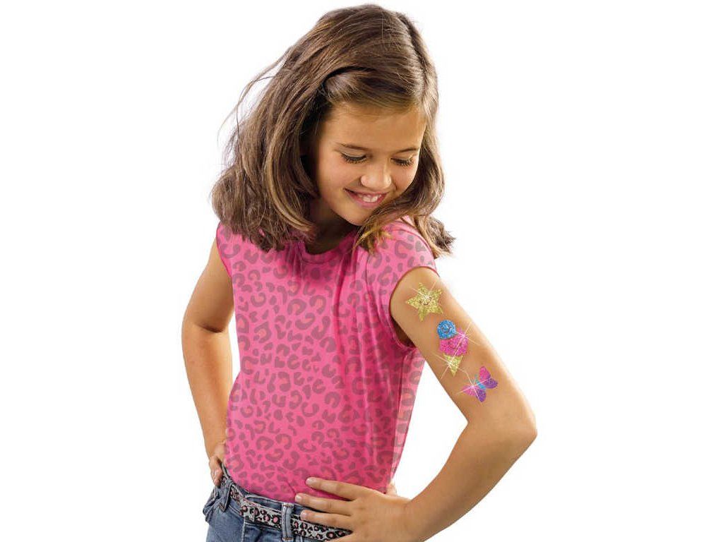Vytvořte si vlastní módní tetování se třpytkami! Vyberte šablonu, přiložte na kůži, odstraňte ochrannou vrstvu, štětcem naneste třpytky a vaše originální tetování je hotovo. Pokud se vám již tetování nelíbí,