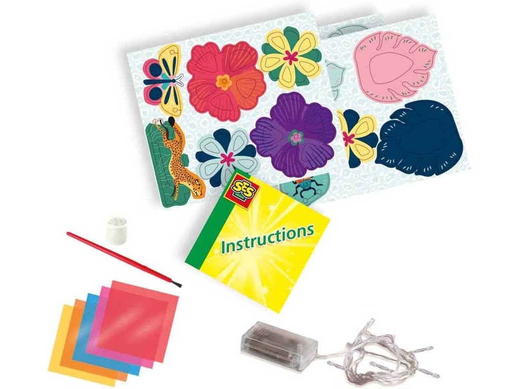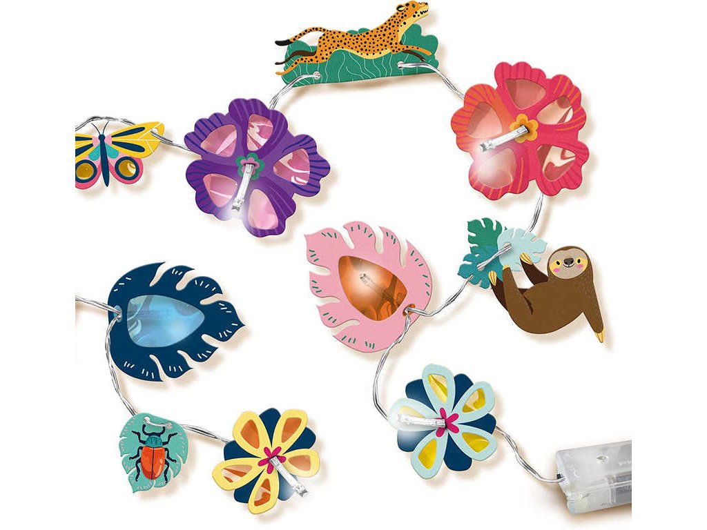 Vyrobte si svou vlastní světelnou girlandu z džungle do své ložnice. Tato sada obsahuje světelnou girlandu s osmi LED světly, pěti barevnými celofánovými listy, lepidlo, štětec, zvířátka z džungle a květiny. Spousta