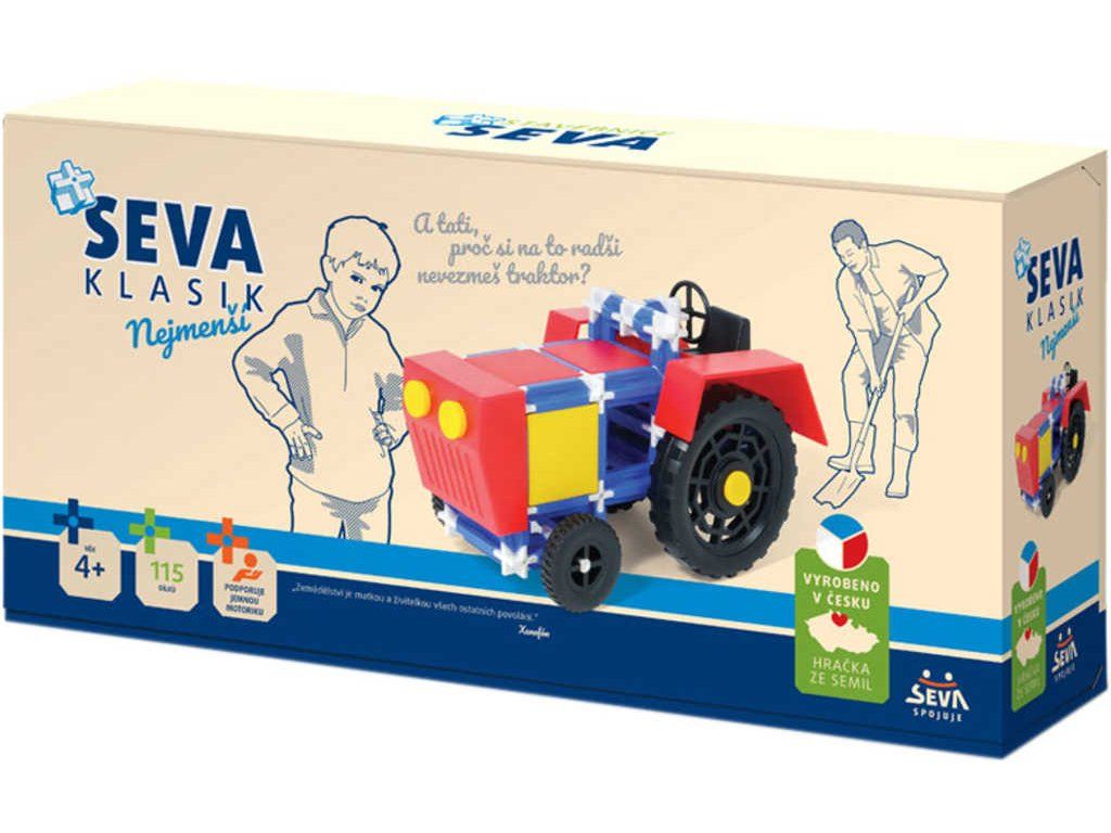 Seva Klasik Nejmenší Traktor je variabilní polytechnická stavebnice, ze které si mohou děti postavit traktor podle přiloženého návodu, nebo vytvořit vlastní stavby a výtvory dle své fantazie.