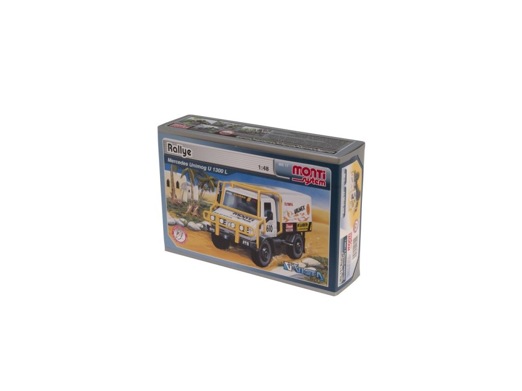 Model Monti System MS č.17 - Rallye je speciální závodní terénní Mercedes Unimog. Mercedes Unimog Monti System MS 17 v měřítku 1:48 patří do řady modelů Monti System STANDARD, tedy