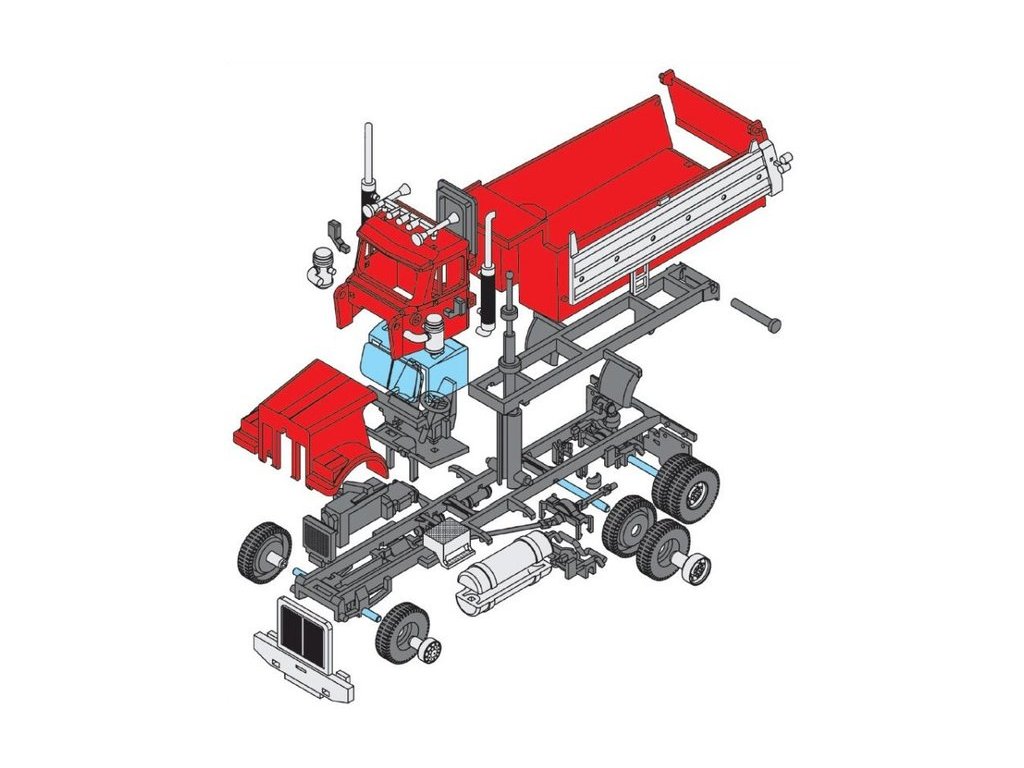 Dětská stavebnice Monti System č. 44 - Dumper Truck se sestavuje bez nutnosti použití lepidla a nanášení barev, jednotlivé díly vyrobené z barevného plastu do sebe přesně zapadají. Je