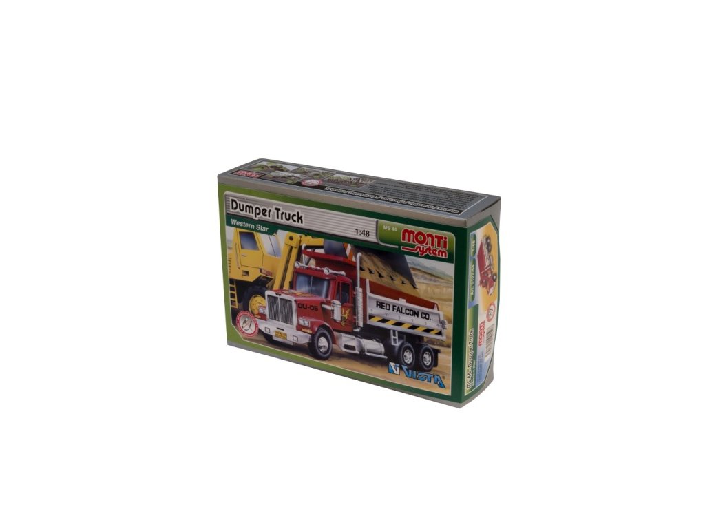 Model Monti System MS č.44 - Dumper Truck je sklápeč Western Star. Western Star Monti System MS 44 v měřítku 1:48 patří do řady modelů Monti System PROFI, tedy mezi nejsložitější stavebnice