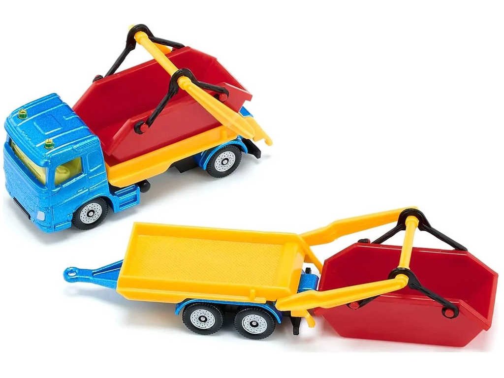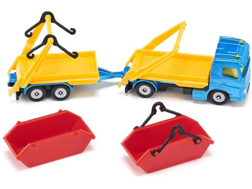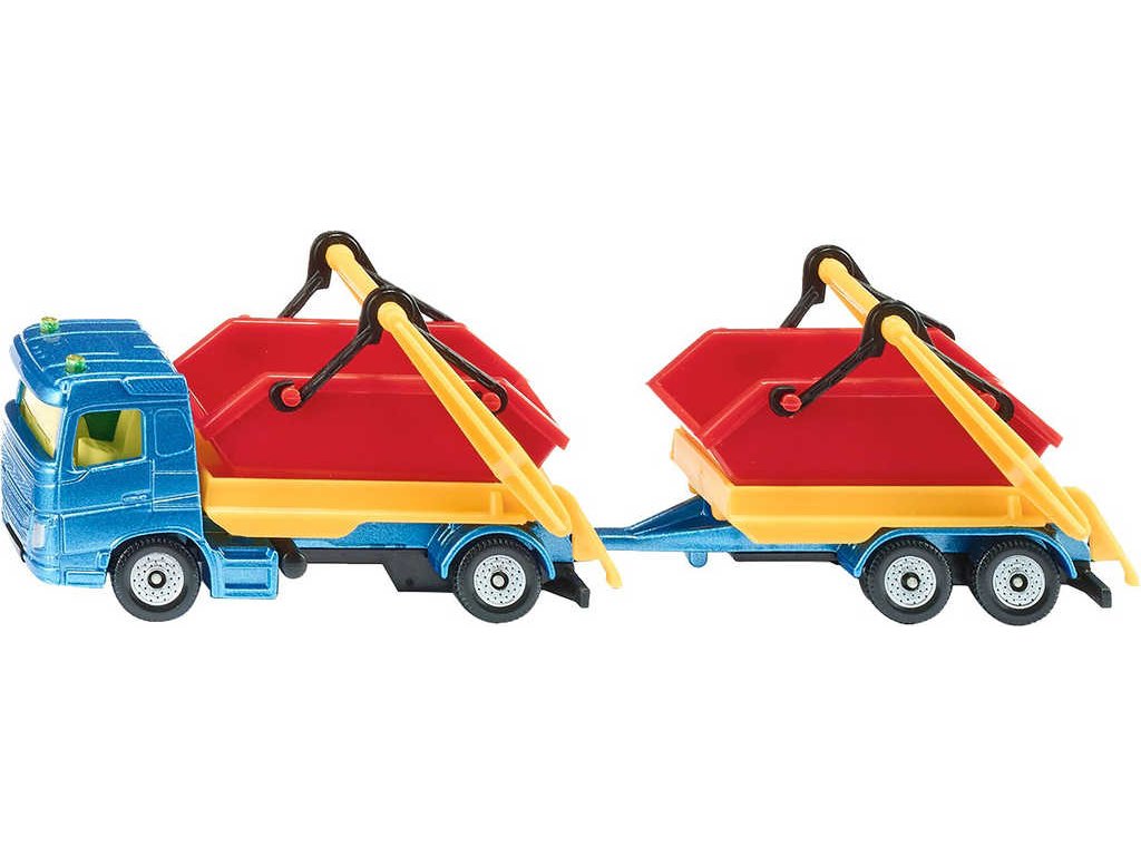 Ať už písek, kámen nebo suť – nákladní automobil s korbou a přívěsem toho uveze hodně! Tahač je dvounápravový nákladní automobil s kovovou kabinou řidiče a přívěs má podvozek s tandemovou nápravou a kovovou plošinou. Na nákladním voze a přívěsu lze přepravovat každý jeden kontejner. Spouštěcí zařízení na obou částech vozidla je pohyblivé, takže korby lze snadno nakládat a vykládat. Volně běžící kola v celé kombinaci zajišťují mobilitu a zjednodušují manévrování. Jasně červené korby vytvářejí poutavý kontrast k modrému nákladnímu automobilu se žlutými vykládacími rameny. Tato jasná a všestranná kombinace vozidel umožní zopakovat nespočet scénářů na staveništi!