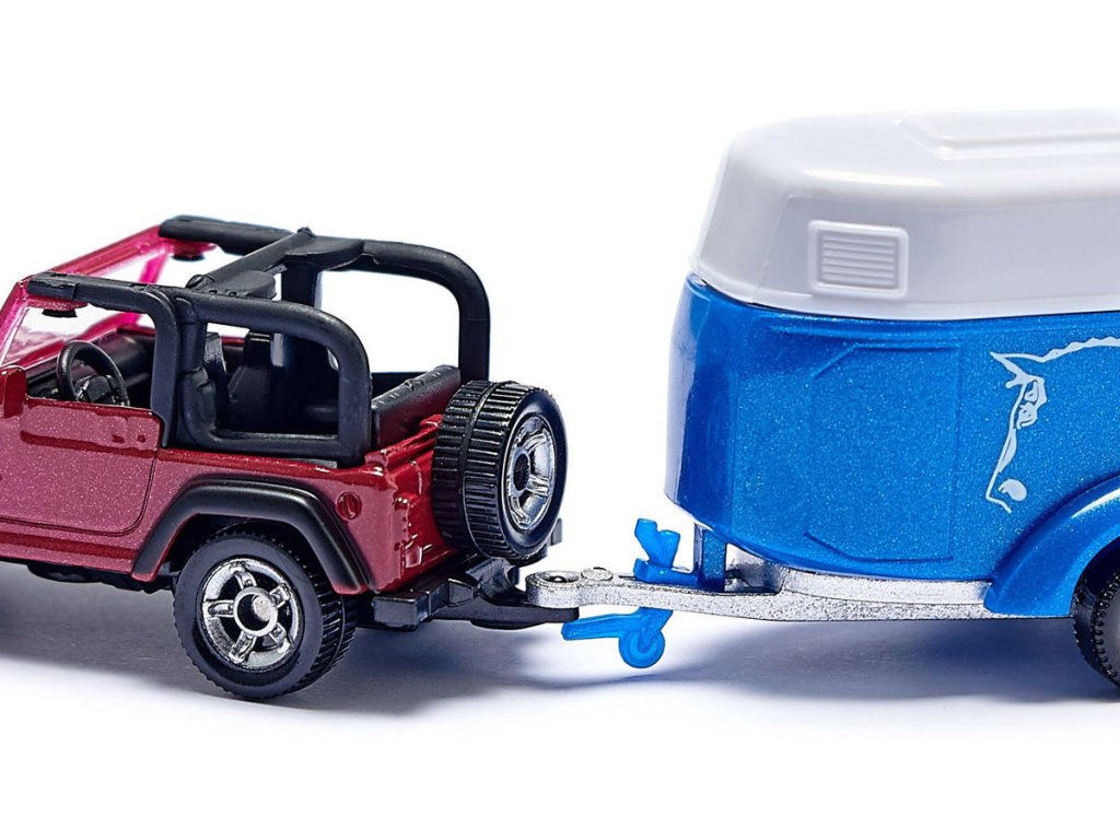 SIKU Blister 1651 - Terénní vůz džíp s vlečkou a koněm, model z kovu a plastu. Velikost setu 14,5cm.