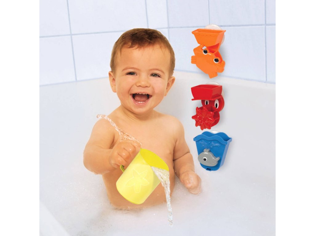 Sada 3 různých aktivit pro nejmenší děti na hraní ve vaně. Každá s přísavkou. Hrneček součástí. Celkem obsahuje 4ks.