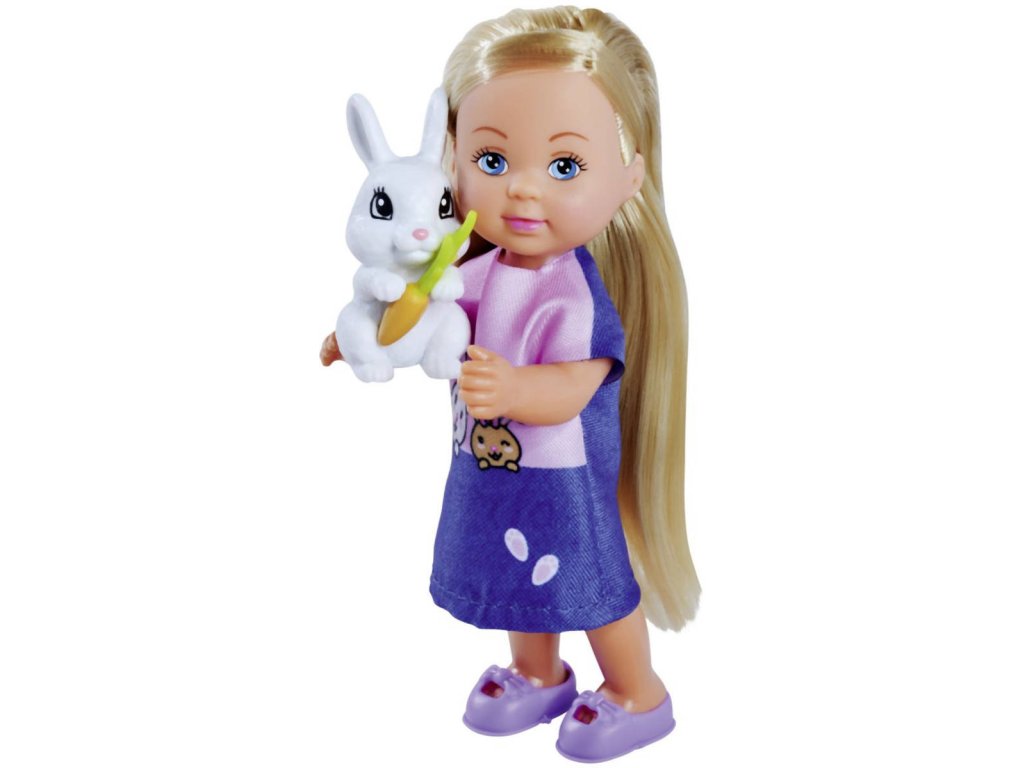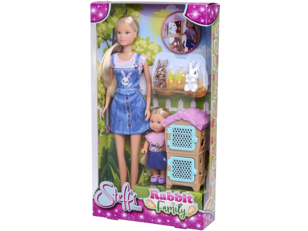 Panenka Steffi Love v sadě s Evičkou a králičí rodinkou. Součástí jsou 2 králíci, mrkve a králíkárna.