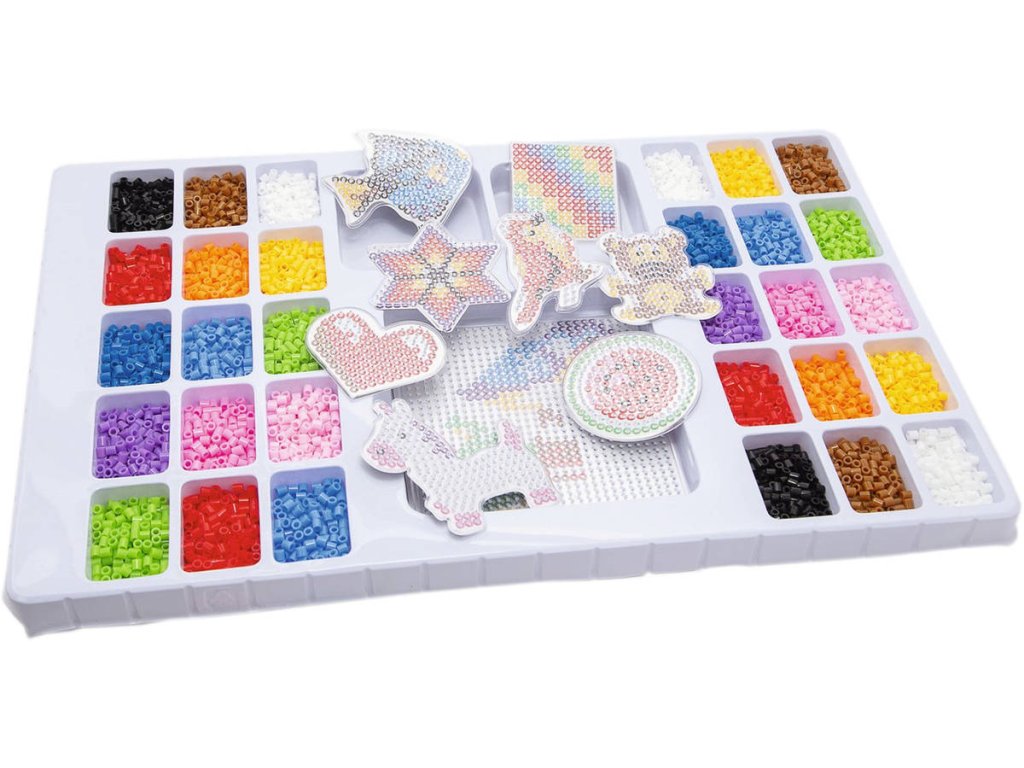 Velká maxi dárková kreativní sada - barevné zažehlovací korálky 6000ks. Různé barvy. Součástí 1 velká podložka + 8 malých podložek s obrázkovou předlohou.