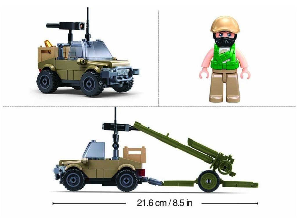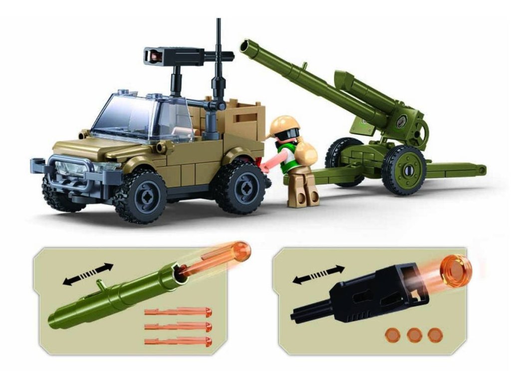Tato stavebnice obsahuje vojenské vozidlo v pískově béžové barvě, které je ideální pro simulaci operací v pouštních nebo suchých oblastech. Model houfnice D30S disponuje otočnou hlavní a realistickým zpracováním dělostřeleckého zařízení. Vozidlo má natahovací mechanismus, který umožňuje pohyb po natažení, což zvyšuje interaktivitu hry. Je vybaveno samopalem jako dalším obranným prvkem a zadní část vozidla obsahuje úložný prostor pro přepravu bedny s municí a dalšího vybavení. Figurka vojáka je oblečena v přilbě a taktickou vestou, což zajišťuje autentický vzhled. Funkce houfnice zahrnují otočnou hlaveň pro nastavení úhlu střelby a simulaci střelby, což přidává na interaktivitě modelu. Doplňky, jako je bedna s municí a další vojenské prvky, zvyšují realističnost hry. Sada obsahuje také podrobný návod pro snadnou montáž, což usnadňuje sestavení modelu. Tato stavebnice je ideální pro malé milovníky vojenské techniky a her s tématikou boje.