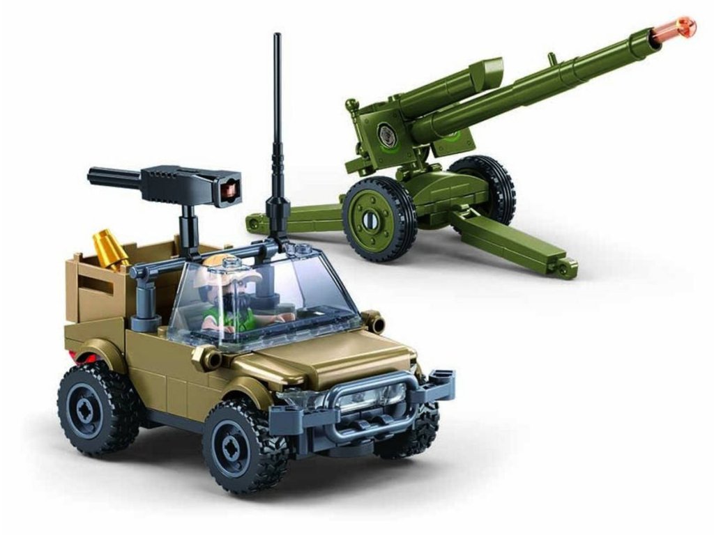 SLUBAN M38-B1255 Houfnice a auto s pohonem na zpětný chod, z edice Army. Kvalitní plastová stavebnice. 138 dílků + 1 figurka. Lze kombinovat s většinou ostatních známých stavebnic.