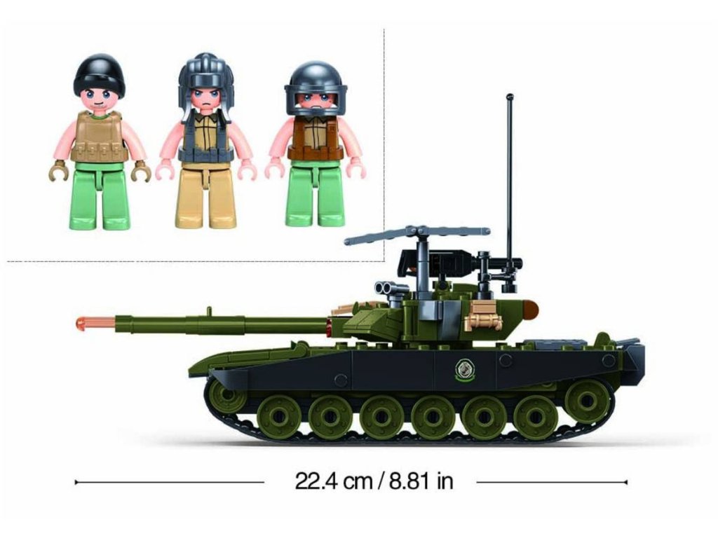 Tato stavebnice představuje model tanku IFR T90AS v realistickém provedení, s barevnou kombinací zelené a černé barvy pro autentický vzhled. Tank je vybaven pohyblivými pásy, které umožňují realistický pohyb. Hlavní kanón slouží pro simulaci těžké palby, zatímco kulomet na věži poskytuje podporu proti pěchotě a lehce obrněným cílům. Otočná věž umožňuje strategické manévry a nastavení úhlu střelby, zatímco konstrukce na věži může sloužit jako ochranný prvek pro posádku nebo vybavení. Stavebnice obsahuje tři figurky vojáků, přičemž jedna z nich může představovat vojáka z nepřátelského vojska. Součástí stavebnice je také dron, který může být použit v rámci herního scénáře jako prostředek útoku. Celková délka sestaveného modelu je přibližně 22,4 cm. Tank nabízí možnost simulovat střelbu, což zvyšuje zábavnost hry. Doplňky, jako jsou různé vojenské prvky, zvyšují realističnost hry. Sada také obsahuje podrobný návod pro snadnou montáž modelu. Tato stavebnice je ideální pro malé milovníky vojenské techniky a her s tématikou boje.