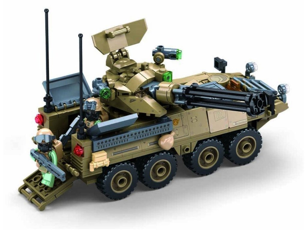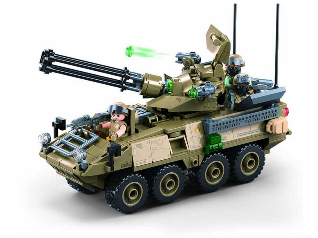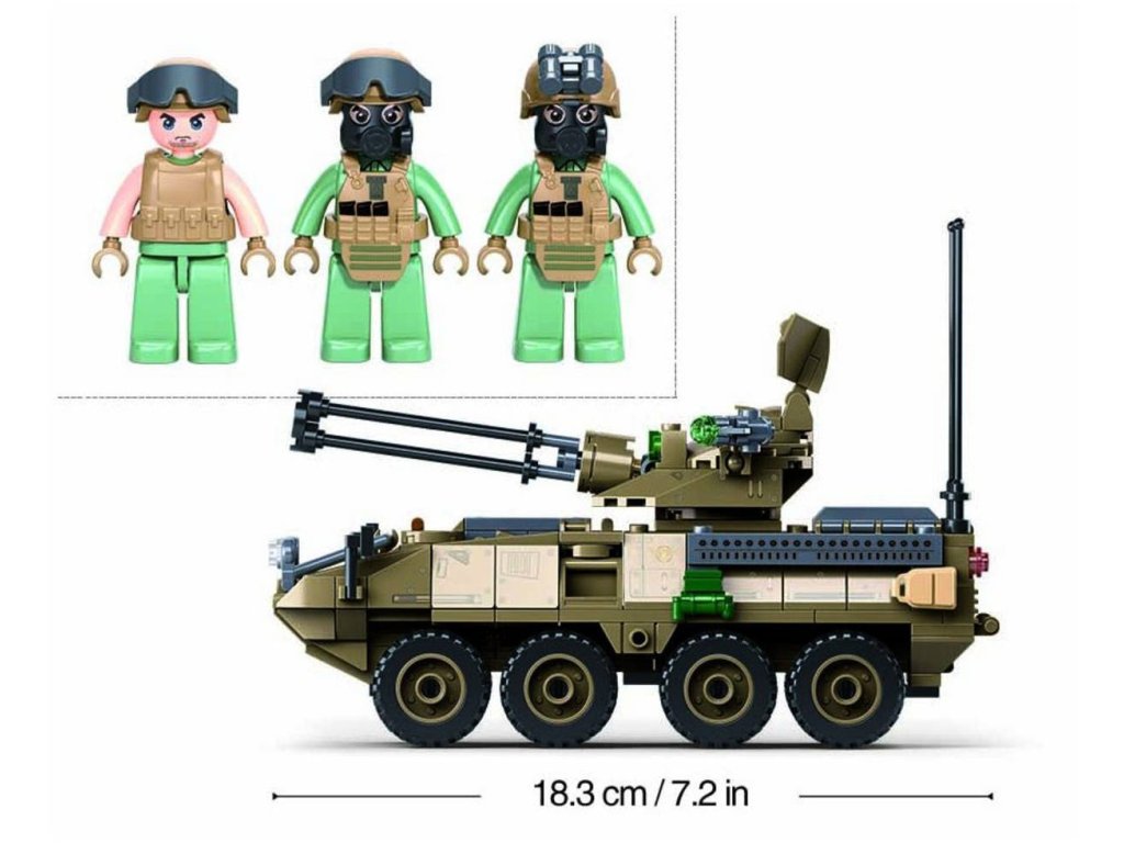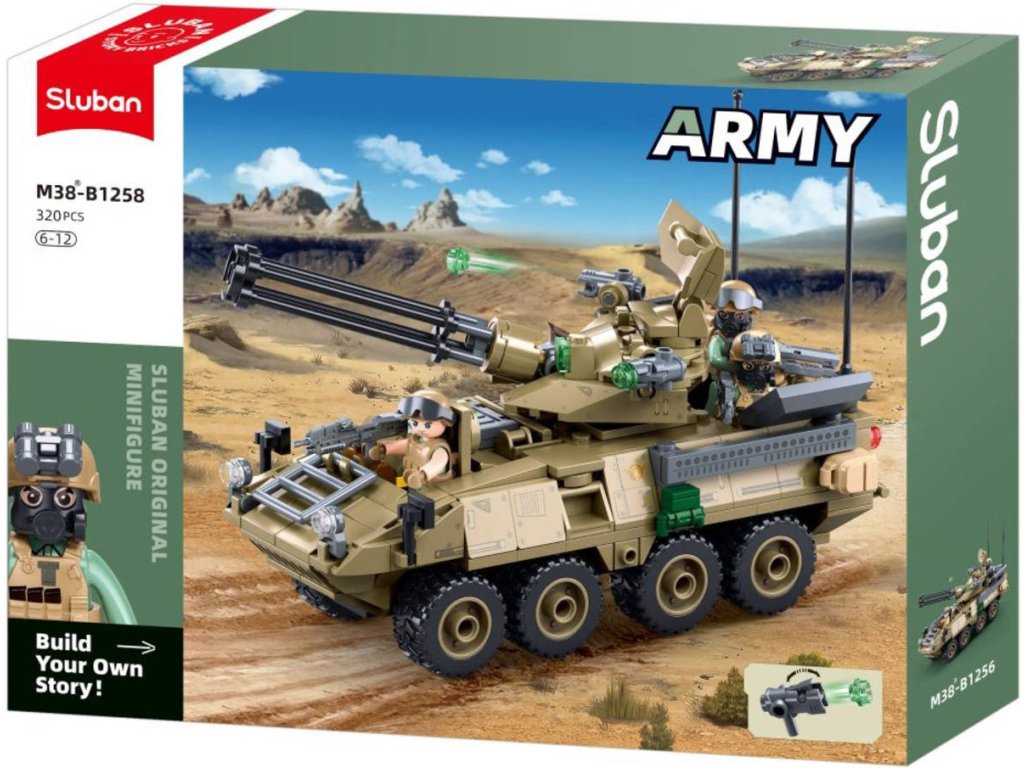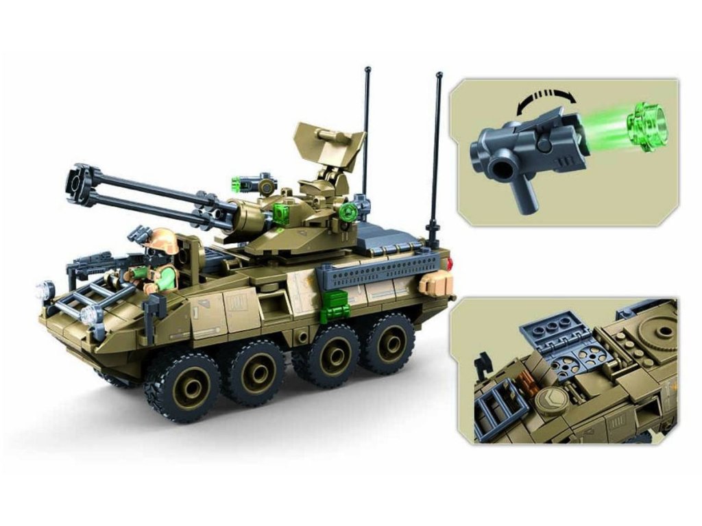 SLUBAN M38-B1258 Transporter OEF Stryker ADS, tank z edice Army. Kvalitní plastová stavebnice. 320 dílků + 3 figurky. Lze kombinovat s většinou ostatních známých stavebnic.