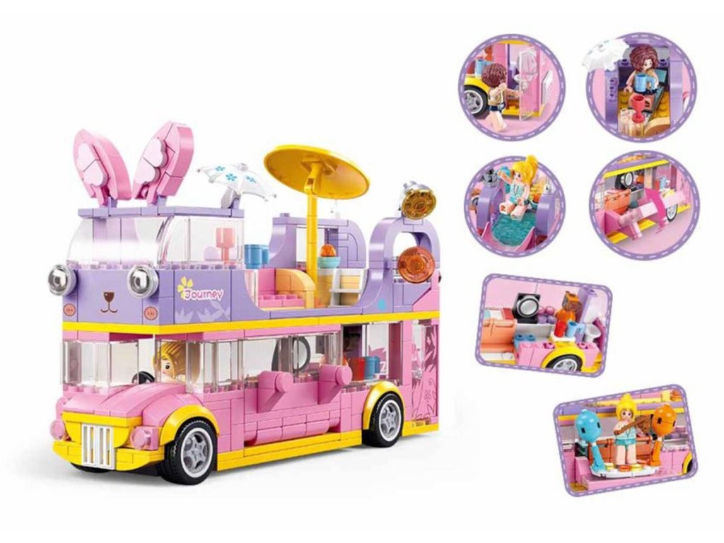 Stavebnice Sluban Girls Dream M38-B1165 Hudební dvoupatrový obytný vůz je roztomilou stavebnicí pro dívky. S 412 dílky vytvoří po sestavení obytný vůz dlouhý téměř 25cm, který je plný zábavných prvků a detailů. Spodní patro slouží jako obytná zóna se záchodem a toaletním stolkem, boční stěna se dá odklopit a proměnit v minijeviště s reproduktory pro figurku zpěváka. Vrchní patro je navrženo jako otevřený prostor pro párty, doplněný o skluzavku pro zábavu i rychlý sestup. Zajímavostí je, že z přední části vozu ve vrchním patře vyčnívají dvě uši, díky kterým vůz zepředu připomíná obličej zajíčka. Součástí stavebnice jsou čtyři figurky, které rozšiřují možnosti hraní a představují členy hudební kapely na cestách. Stavebnice je vhodná pro děti od 6 let a díky svým barevným a hravým prvkům je ideálním dárkem pro dívky, které mají rády hudbu, cestování a kreativní hraní.