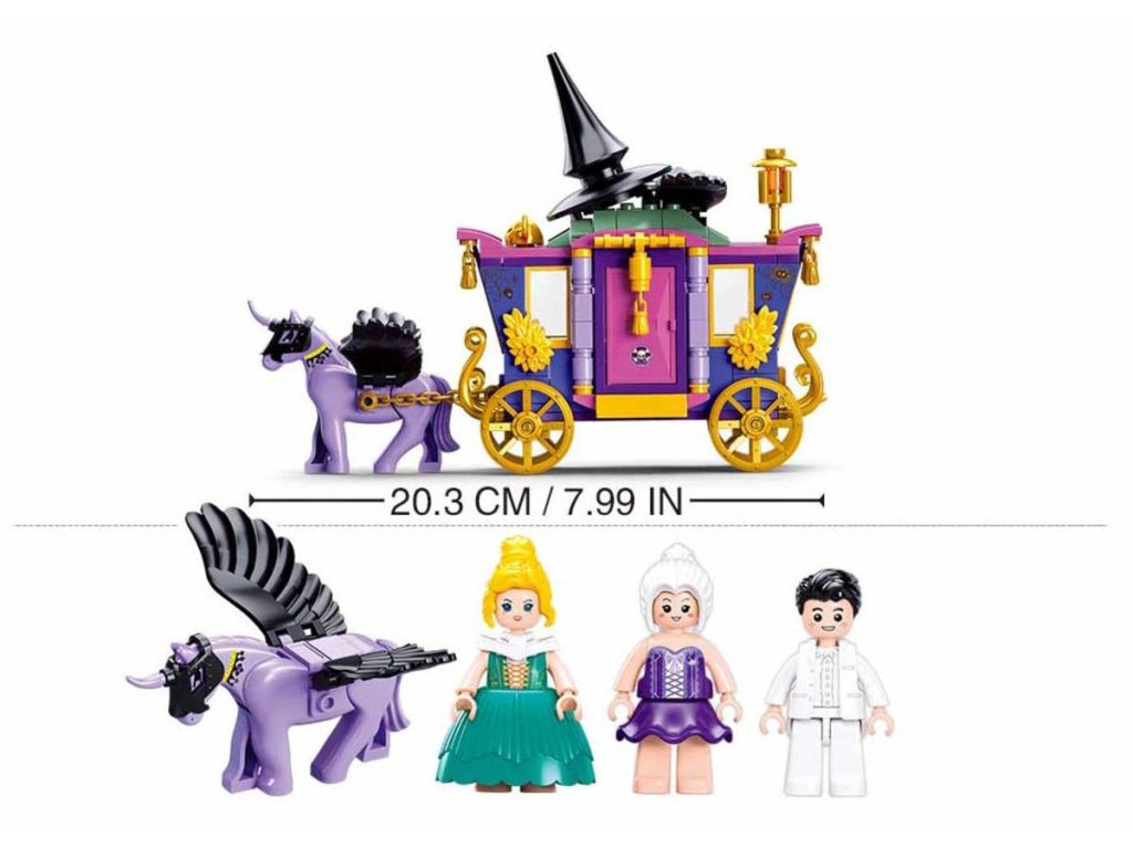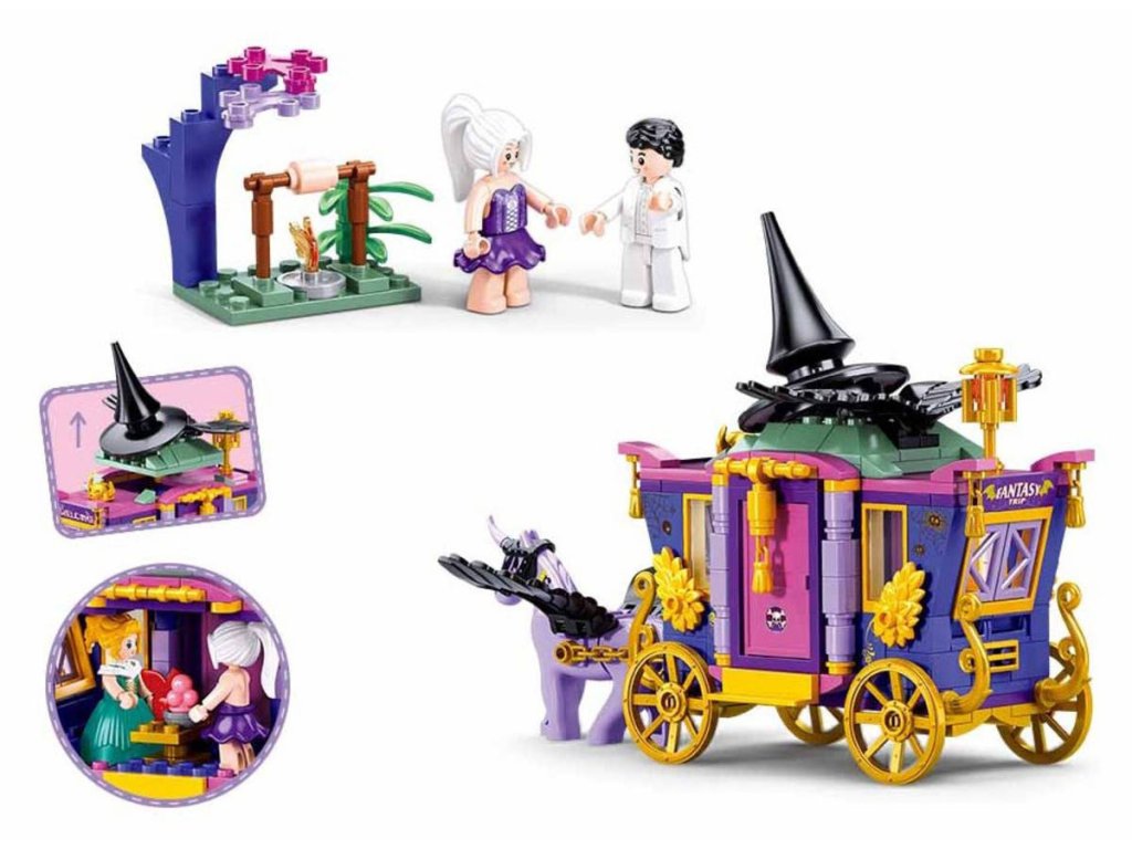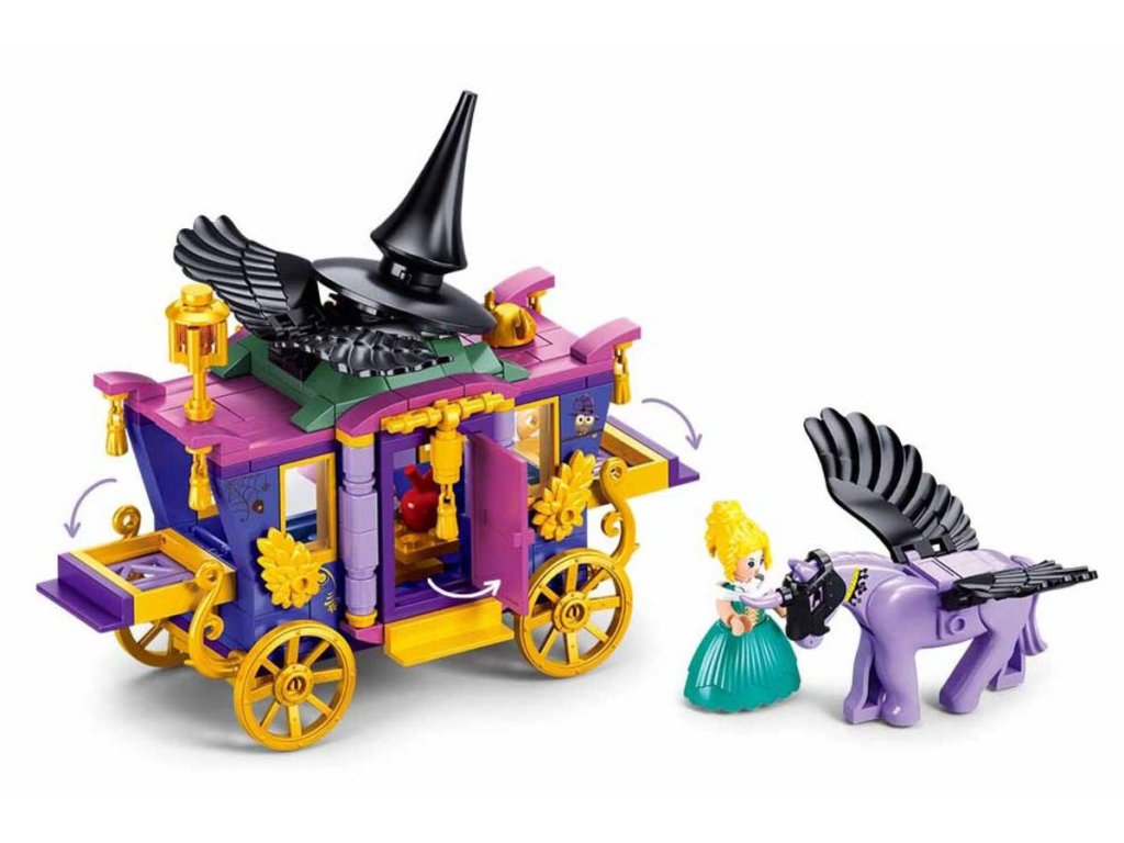Kouzelný kočár vyniká fialovým a růžovým designem, jehož černá špičatá střecha má tvar čarodějnického klobouku. Zdobení zlatými ornamenty a nápis "WELCOME" dodávají kočáru kouzelný nádech. Žlutá kola poskytují klasický vzhled a zajišťují, že kočár se snadno pohybuje. Otevírací dveře a sklopné části kočáru na přídi a zádi umožňují snadný přístup dovnitř. Hlavním tahákem je fialový jednorožec s černými křídly, který je připojen k přední části kočáru a dodává celému setu na atraktivitě. Děti se mohou těšit na tři postavy – dvě čarodějky a jednoho čaroděje v bílém. Různorodé oblečení postav odráží jejich magický charakter a umožňuje vytváření rozmanitých příběhů. Scénické prvky, jako je ohniště, obohacují celou scénu a přidávají další možnosti pro hru. Velikost kočáru po sestavení činí přibližně 20,3 cm na délku. Různé magické doplňky a dekorace uvnitř kočáru zajišťují, že každé hraní bude jedinečné a plné objevování. Tato stavebnice nabízí kouzelnou scénu s bohatými detaily, které podporují kreativní hru a vytváření příběhů v magickém světě.