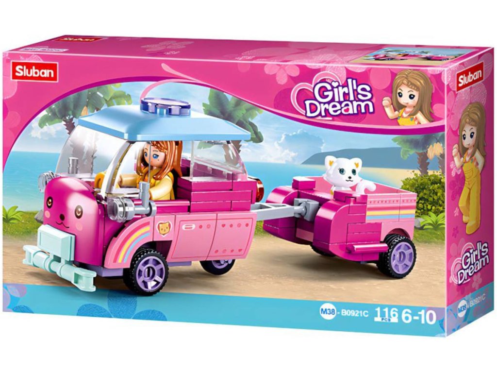 SLUBAN Girls Dream (M38-B0921C) Kočičí automobil s vlečkou. Kvalitní plastová stavebnice. Lze kombinovat s většinou ostatních známých stavebnic. Součástí 1 figurka.