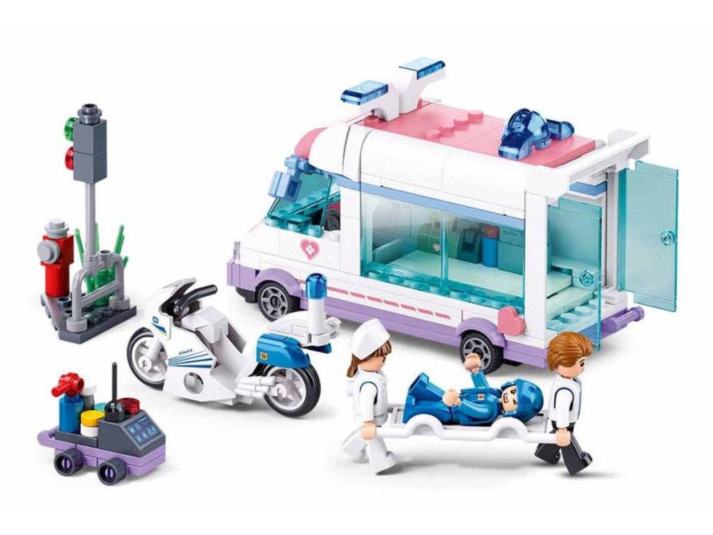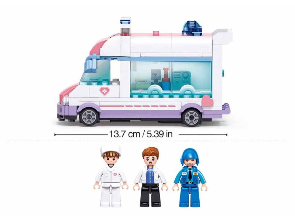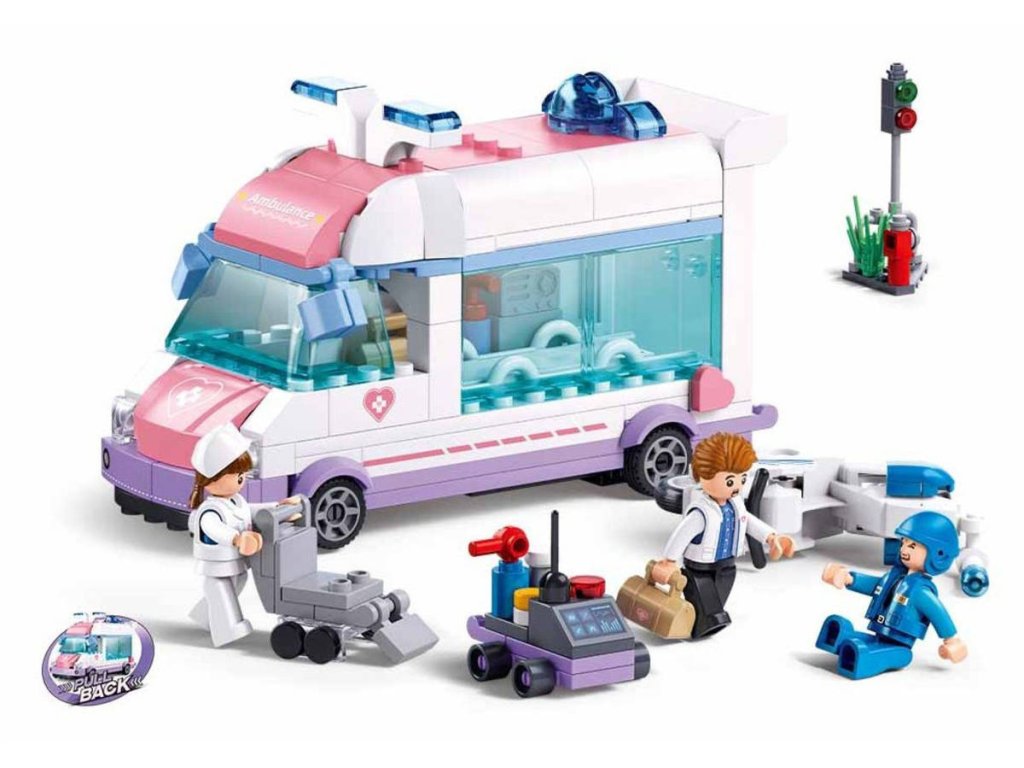 SLUBAN M38-B1213 Pojízdná záchranná služba první pomoci s pohonem na zpětný chod, z edice Metropolis. Kvalitní plastová stavebnice. 251 dílků + 3 figurky. Lze kombinovat s většinou ostatních známých stavebnic.