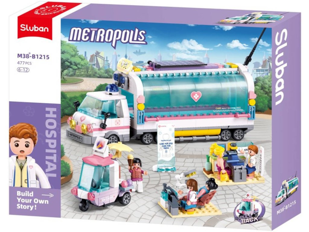 SLUBAN M38-B1215 Mobilní ošetřovací vůz, auto s pohonem na zpětný chod, z edice Metropolis. Kvalitní plastová stavebnice. 477 dílků + 5 figurek. Lze kombinovat s většinou ostatních známých stavebnic.