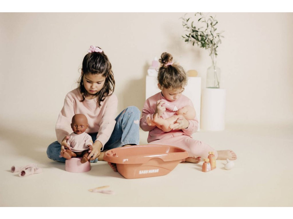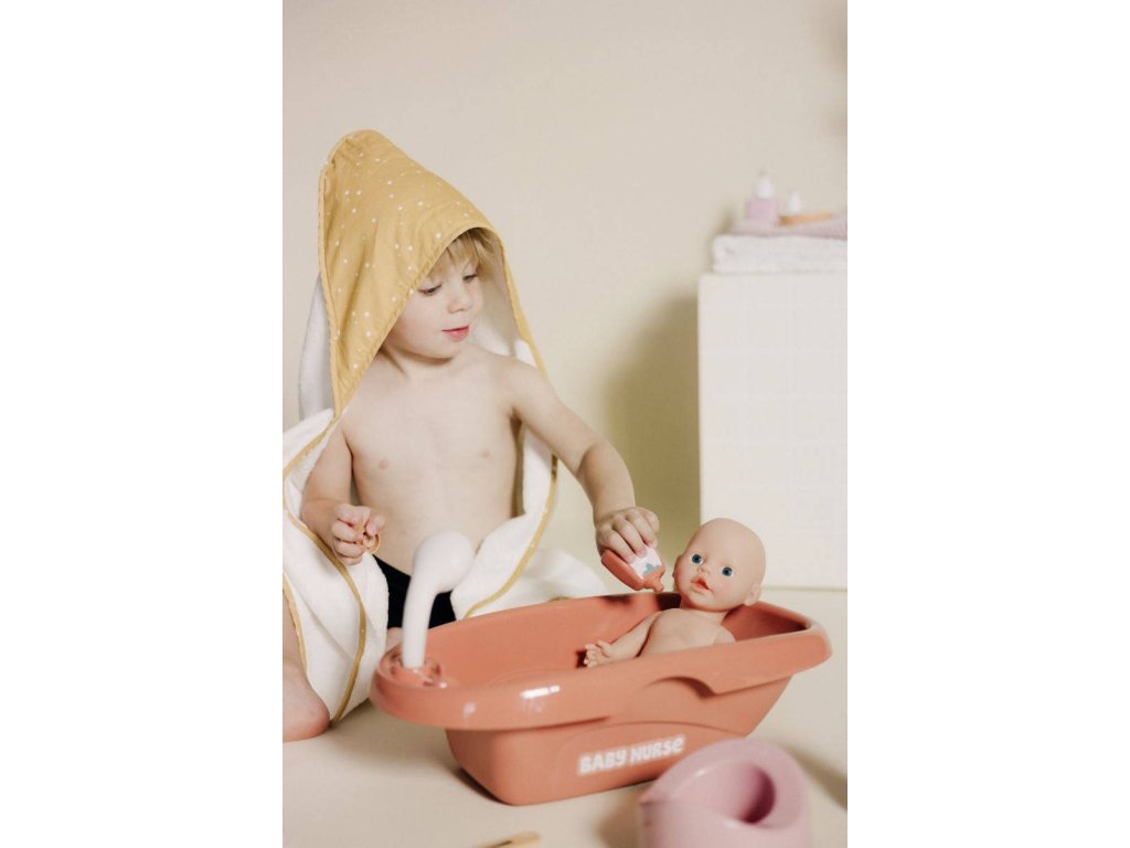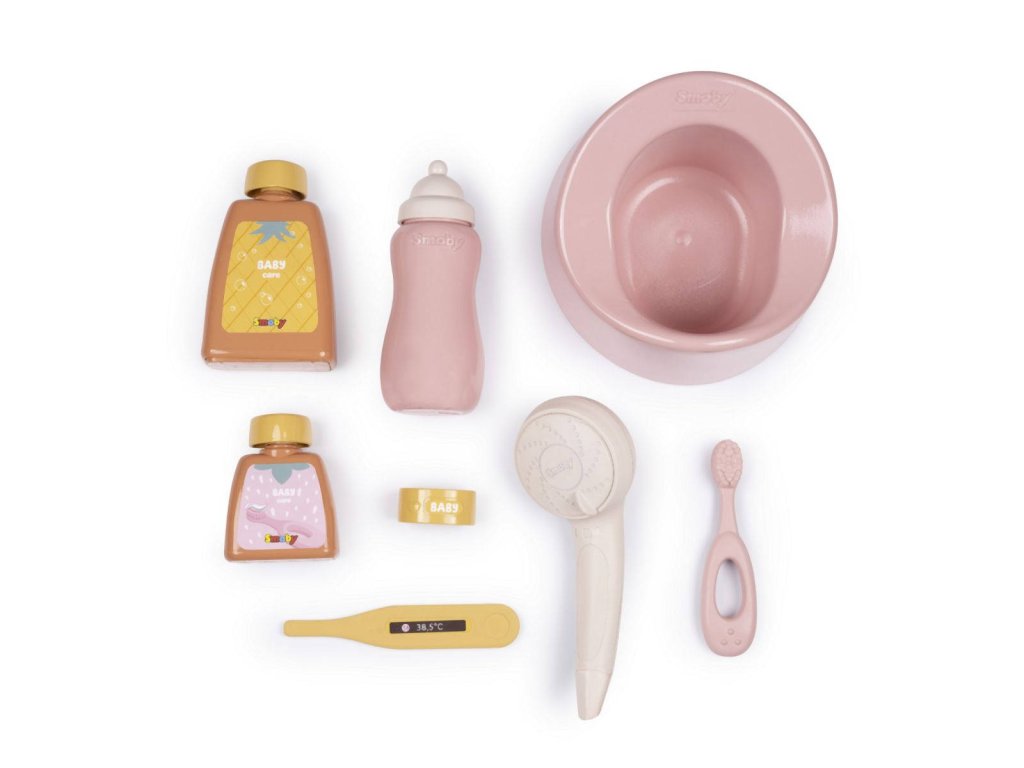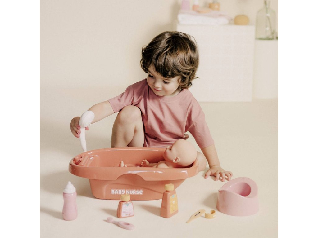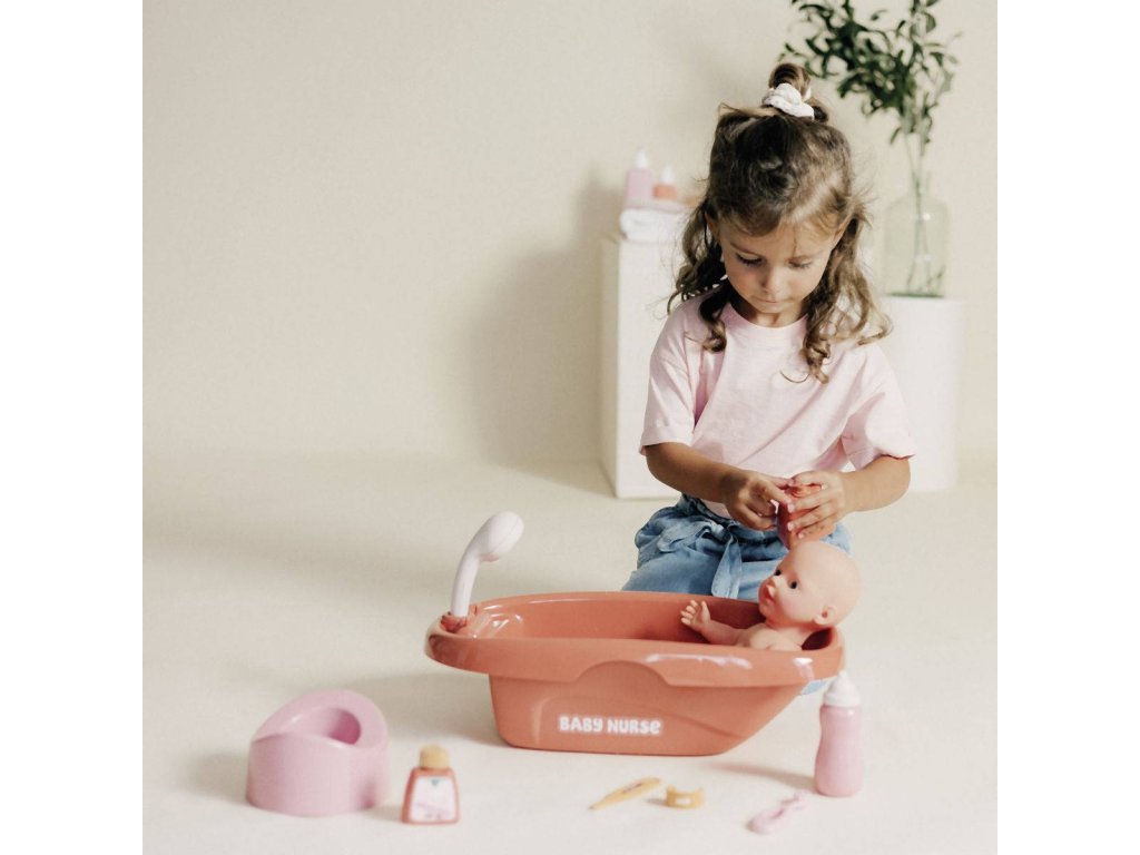 Vanička pro panenky Baby Nurse s odnímatelnou sprchovou hlavicí má mechanickou rotační funkci a usnadňuje mytí vlásků panenky. Součástí příslušenství je kromě lahvičky na mléko a zubního kartáčku také nočník, klinický teploměr, náramek a 2 lahvičky s pečujícím příslušenstvím.