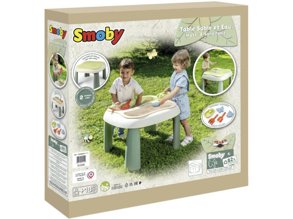 Venkovní stoleček z kvalitního, robustního plastu. Součástí stolu jsou dva vyjímatelné boxy na písek a vodu, lodička, hrabičky, lopatička a 2 formičky na písek. Dodáváno i s ochranným víkem (2 části). Vhodný i do prostor s nedostatkem místa. Uprostřed stolu otvor pro slunečník (není součástí balení). Plastové díly jsou ošetřeny anti-UV, což zajišťuje dobrou odolnost a stálost barev v průběhu času. Tento výrobek obsahuje minimálně 83% recyklovaného materiálu.