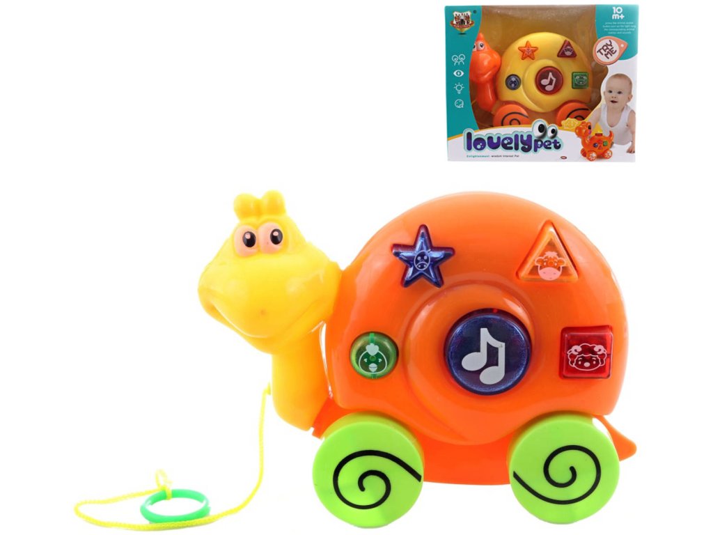 Tahací veselý šneček na kolečkách, o velikosti 15cm, pro nejmenší děti. Šnek hraje melodie a zvuky zvířátek. Hračka na baterie, se světlem a zvukem. 2 barevné varianty.
