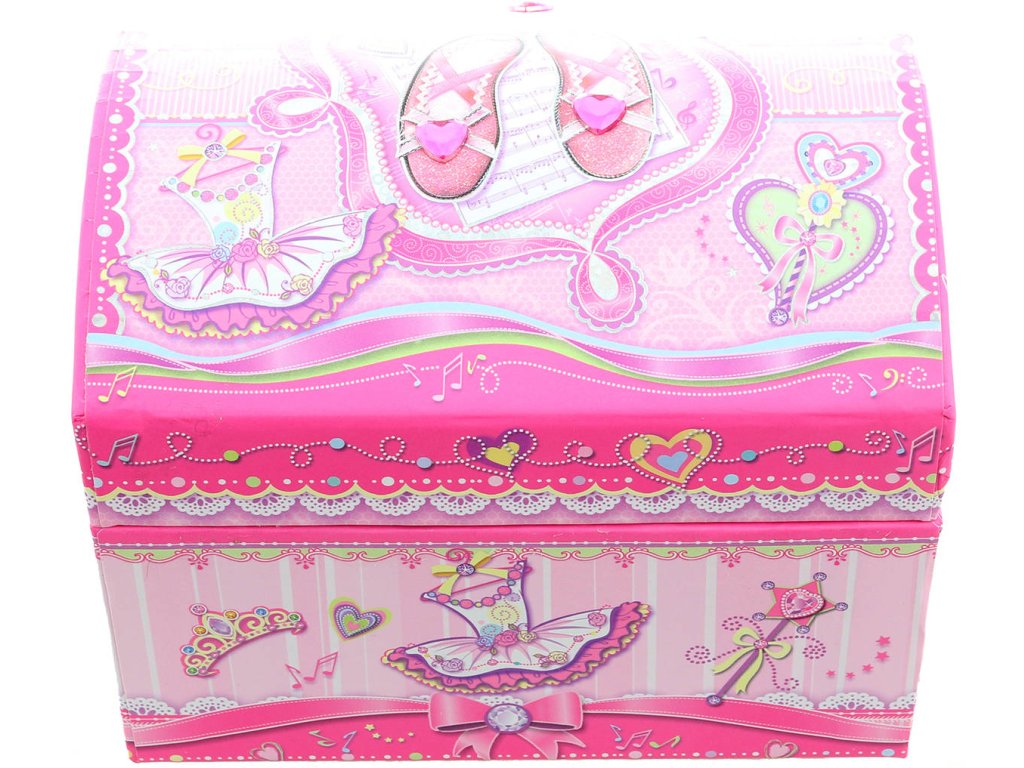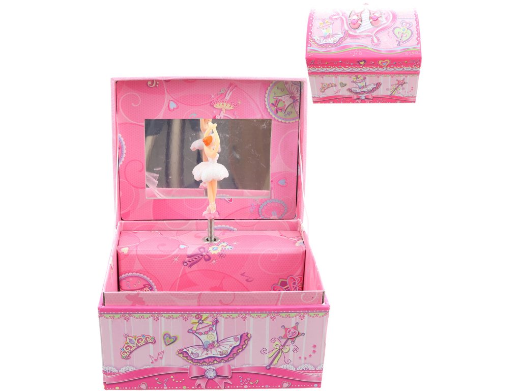 Krásně dekorovaná kartonová hrací skříňka obdelníkového tvaru (truhla) - krabička na šperky, s panenkou baletkou. Uvnitř šperkovnice je zrcátko a panenka, která po natažení klíčku a otevření víka šperkovnice, tančí a hraje. Baleno v sáčku.