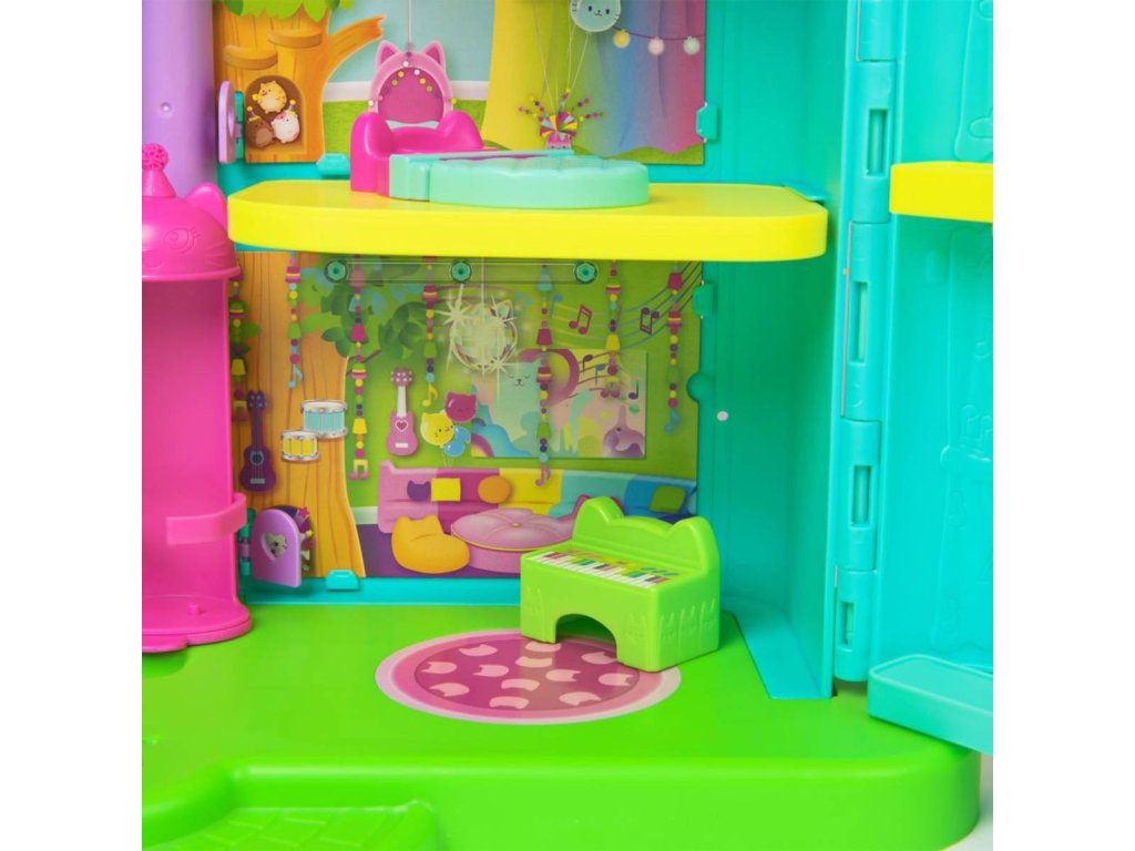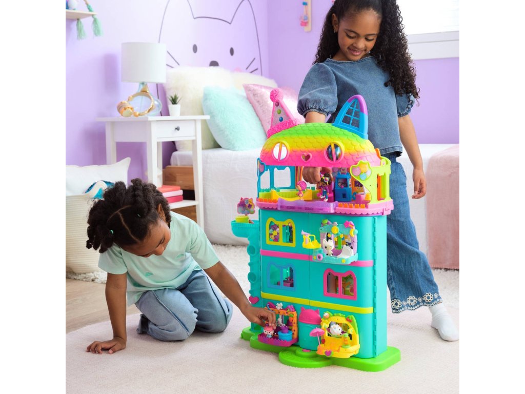 Prozkoumejte okouzlující svět Gábinina kouzelného domku pro oslavy, 60cm vysokého mistrovského díla s duhovým motivem! Popusťte uzdu kreativitě s 9cm figurkou Gábi, nábytkem do kouzelného domku a 10 doplňky, jako je toaleta s kočičím motivem, klavír nebo DJ stůl a mnoho dalšího! Zahrajte si na dýdžejském stole a využijte kočičí výtah pro vstup do šesti místností a na střešní hřiště. Vhoďte zásilky do doručovací věže a stiskem tlačítka objevte tajné poklady. Poté otevřete kouzelný domek a poslechněte si 6 zvukových efektů ze seriálu.