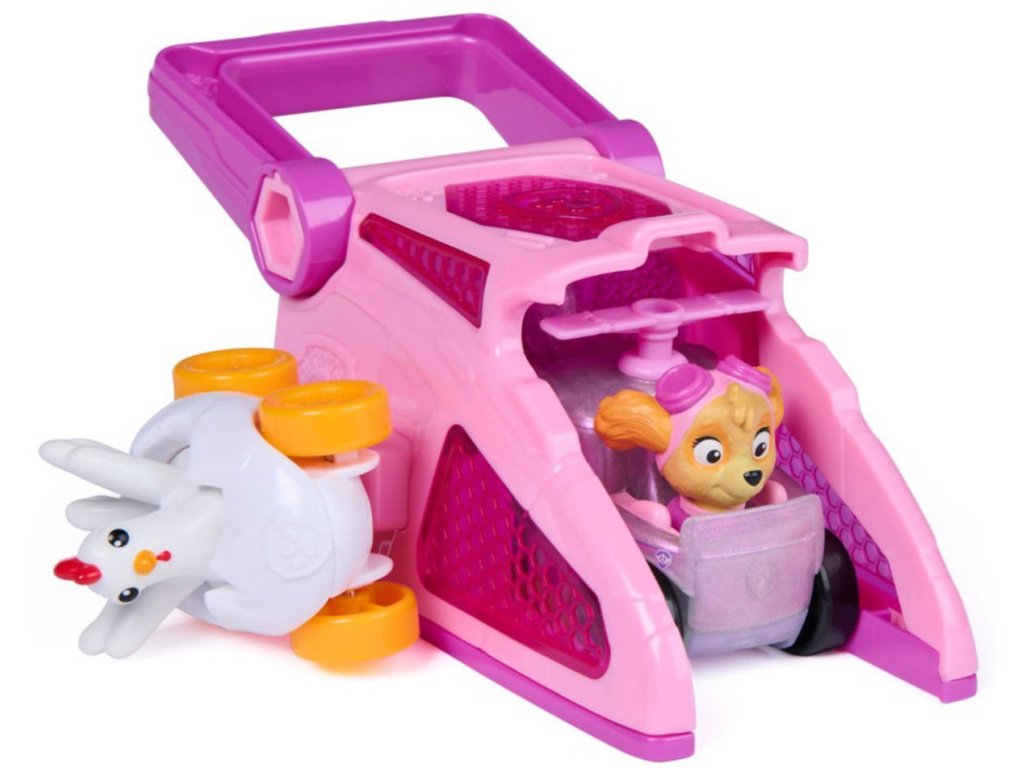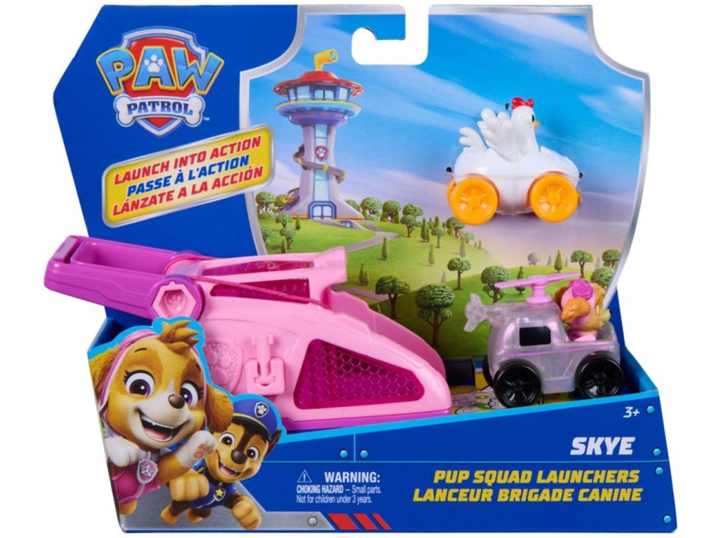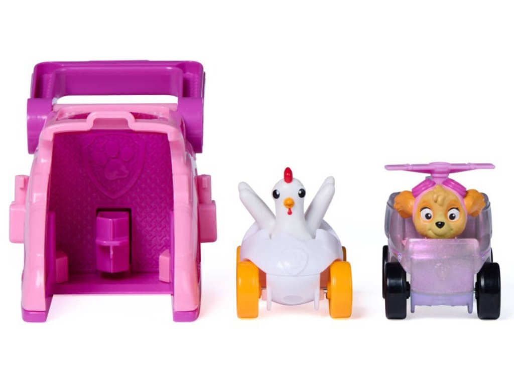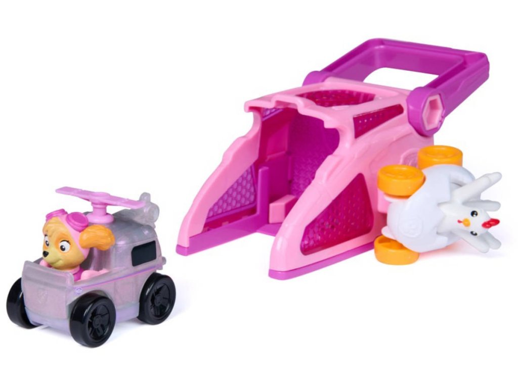 Herní set Vystřelovací zařízení - Skye v licenci Paw Patrol. Součástí vystřelovač a 2 malá autíčka se závodníkem, o velikosti 6,5cm.