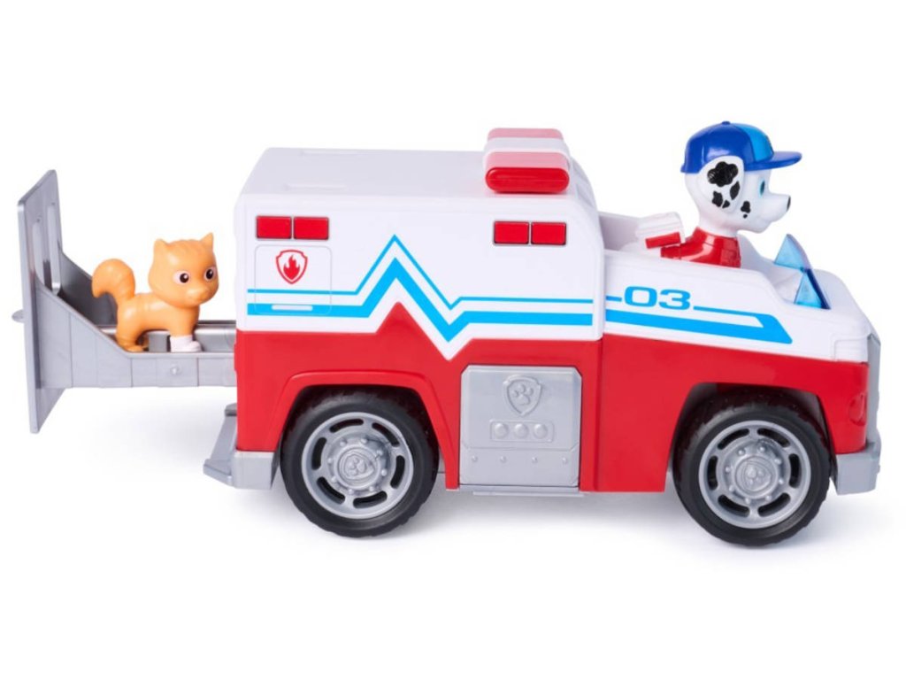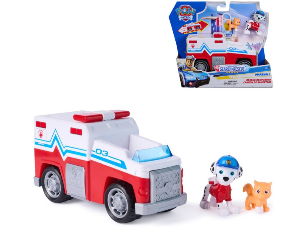 Tématické záchranářské vozidlo Paw Patrol Search and Rescue - Marshall. Velikost vozidla 15cm. Součástí 2 zvířátka.
