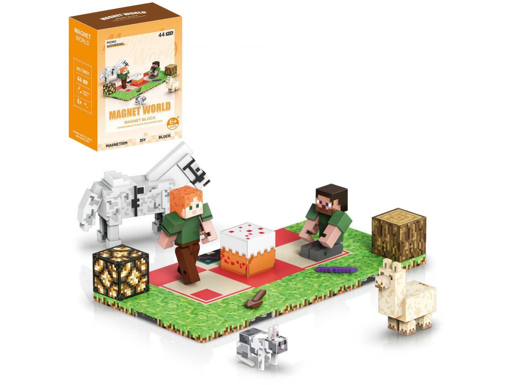 Magnet World 3D magetická stavebnice Piknik ve stylu Minecraft. Součástí 2 figurky s doplňky a podložkou. Velikost postaviček 5cm. 44 dílků.