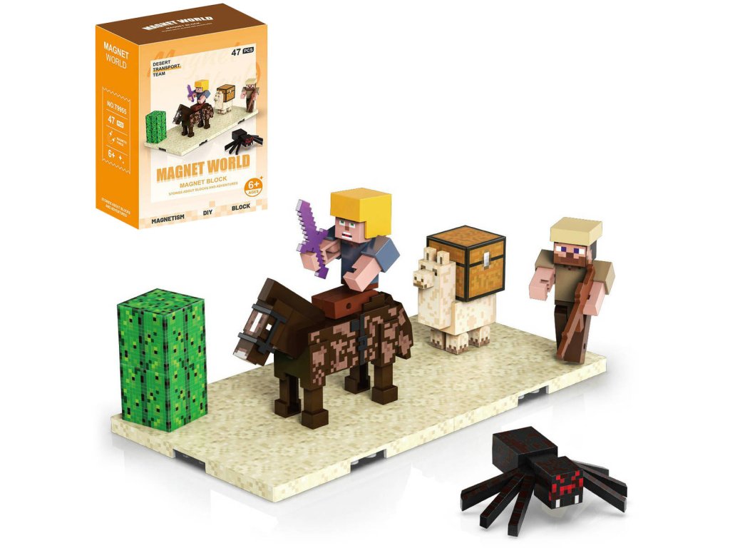 Magnet World 3D magetická stavebnice Poušť ve stylu Minecraft. Součástí 2 figurky s doplňky a podložkou. Velikost postaviček 5cm. 47 dílků.