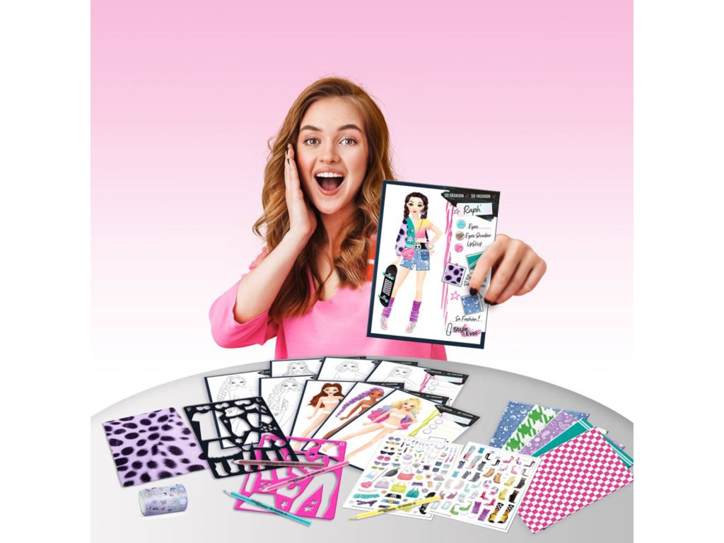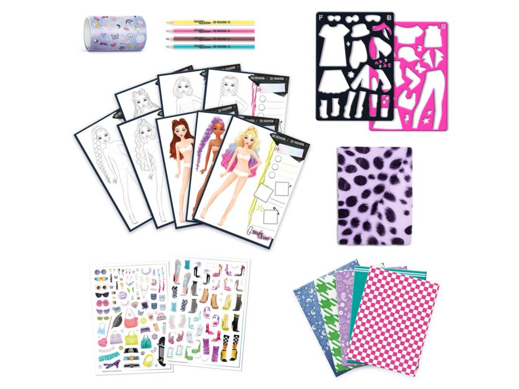 Splňte si sen a vytvořte návrhy jako módní návrhář. V sadě jsou k dispozici šablony, samolepicí látky, nálepky, fixy, barevné archy a roličky pro vytvoření jedinečných módních návrhů.