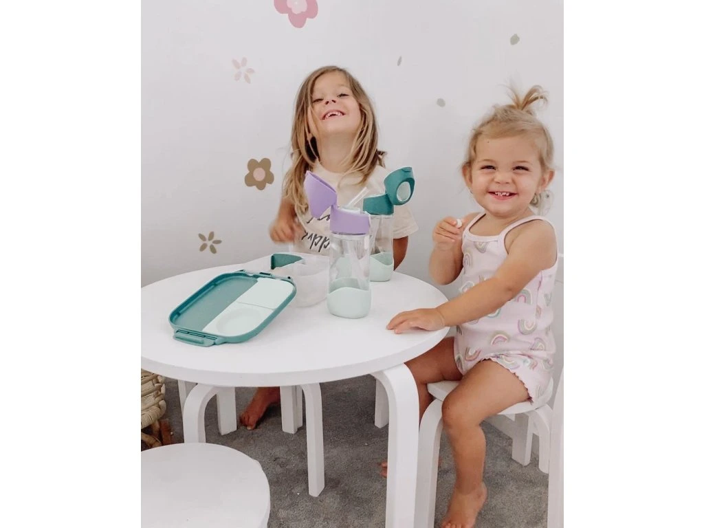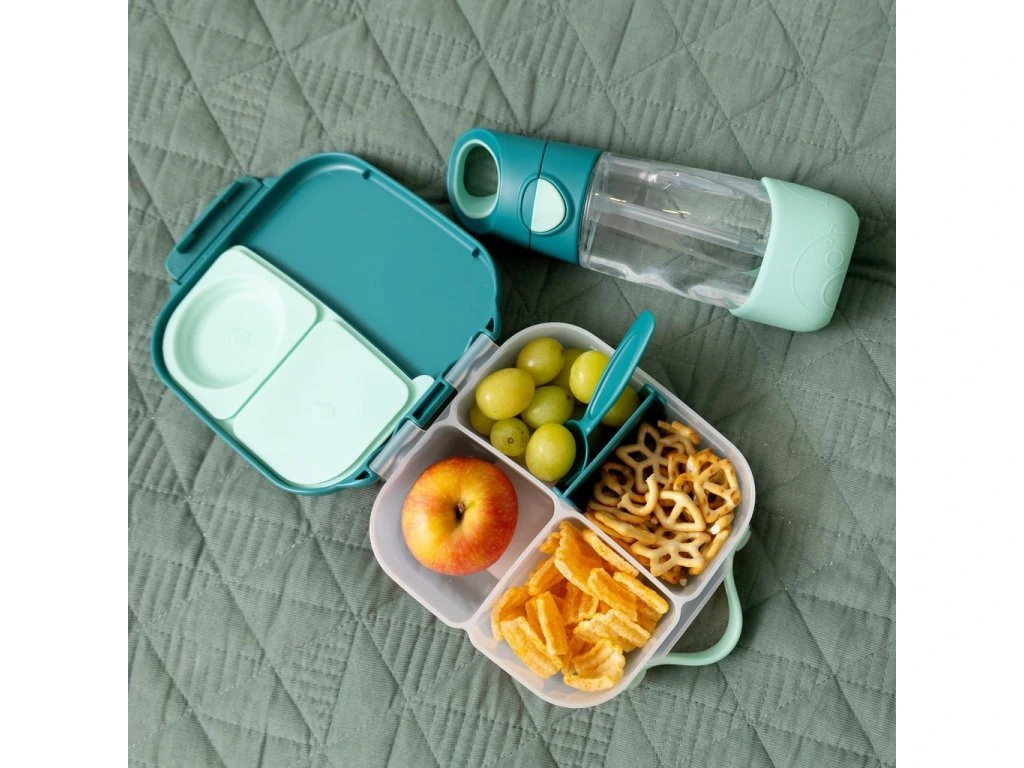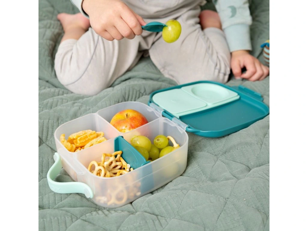 Silikonové těsnění dovolí skladovat v menších odděleních jogurt nebo dip (nikoli tekutiny/nápoje). Jedna z vnitřních přepážek je vyjímatelná a nastavitelná, takže si tento svačinový box přestavíte podle svých chutí a potřeb. Do krabičky se vejde například i wrap nebo banán. Jednoduché otevírání je navrženo tak, aby se děti mohly obsloužit samy.