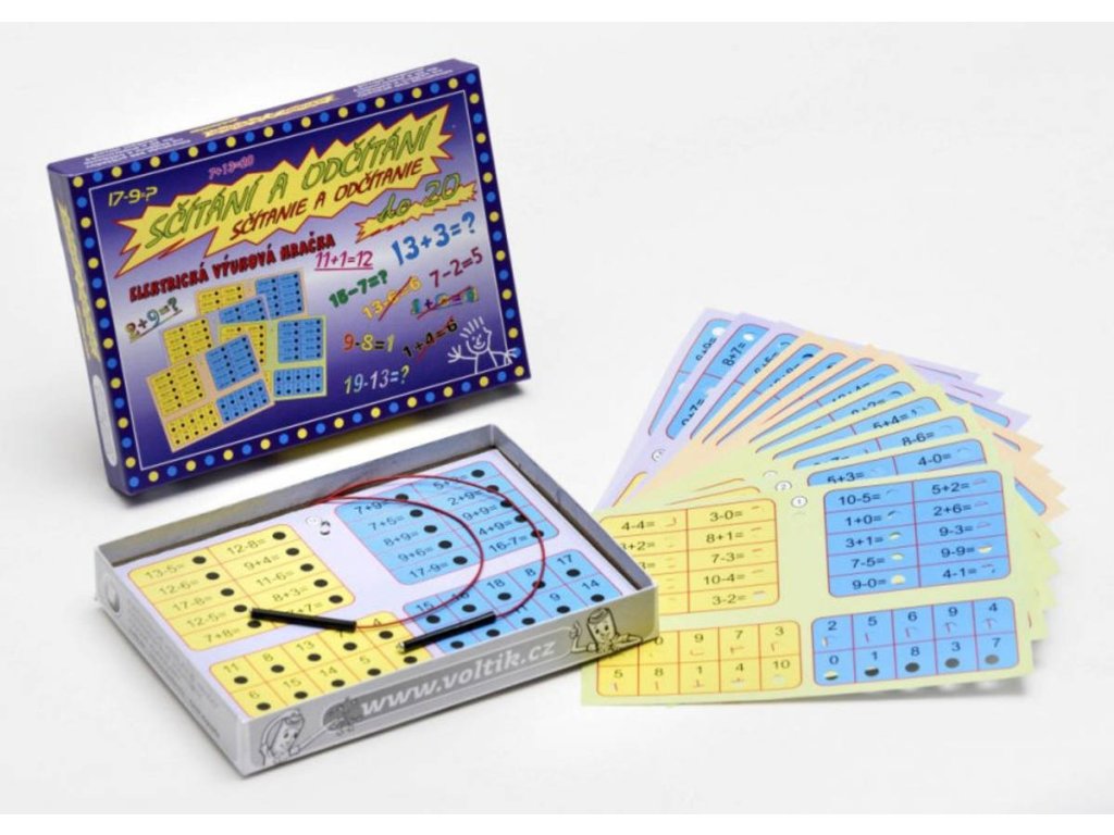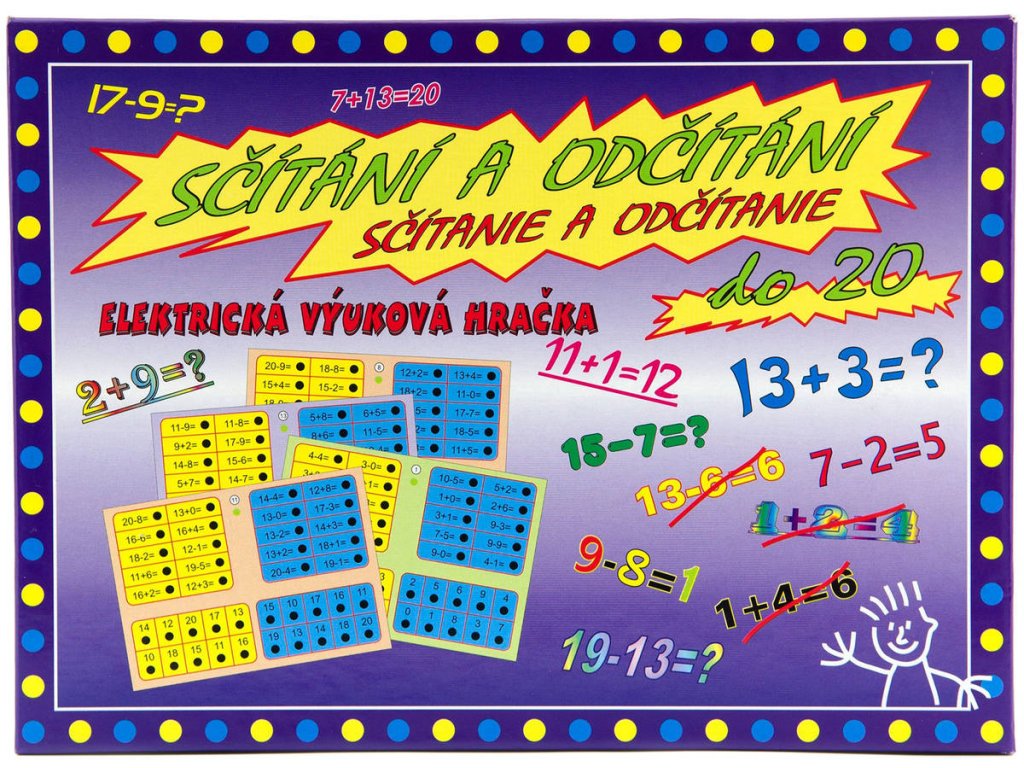 Elektrická výuková hračka určená dětem od 6 let. Obsahuje 320 příkladů na sčítání a odčítání do 20 na 16 výměnných listech.