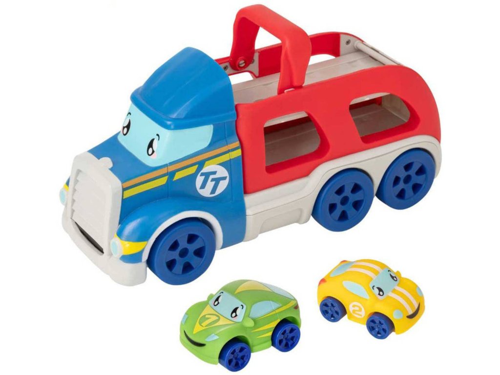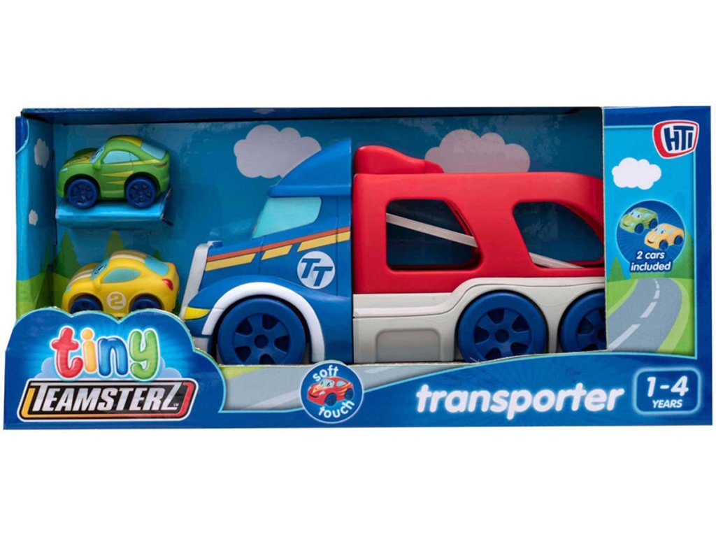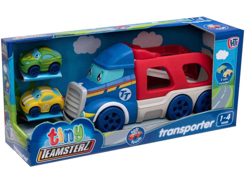Nalož je a odvez je v Tiny Teamsterz Transporter. Součástí jsou 2 volná auta Tiny Teamsterz, jsou měkká a snadno uchopitelná a navržená v jasných, zábavných barvách se zábavnými tvářemi postav. Transportér je otočný a pohyblivé nakládací rampy umožňují snadnou přepravu do horní nebo spodní úrovně, která dohromady pojme až 4 auta. Zaoblená estetika Tiny Teamsterz Transporter s veselou tváří osloví předškolní děti a nadšence do nových aut.