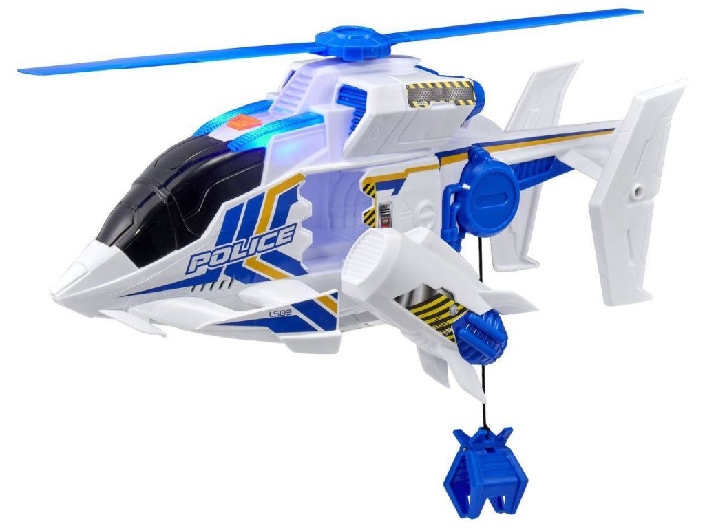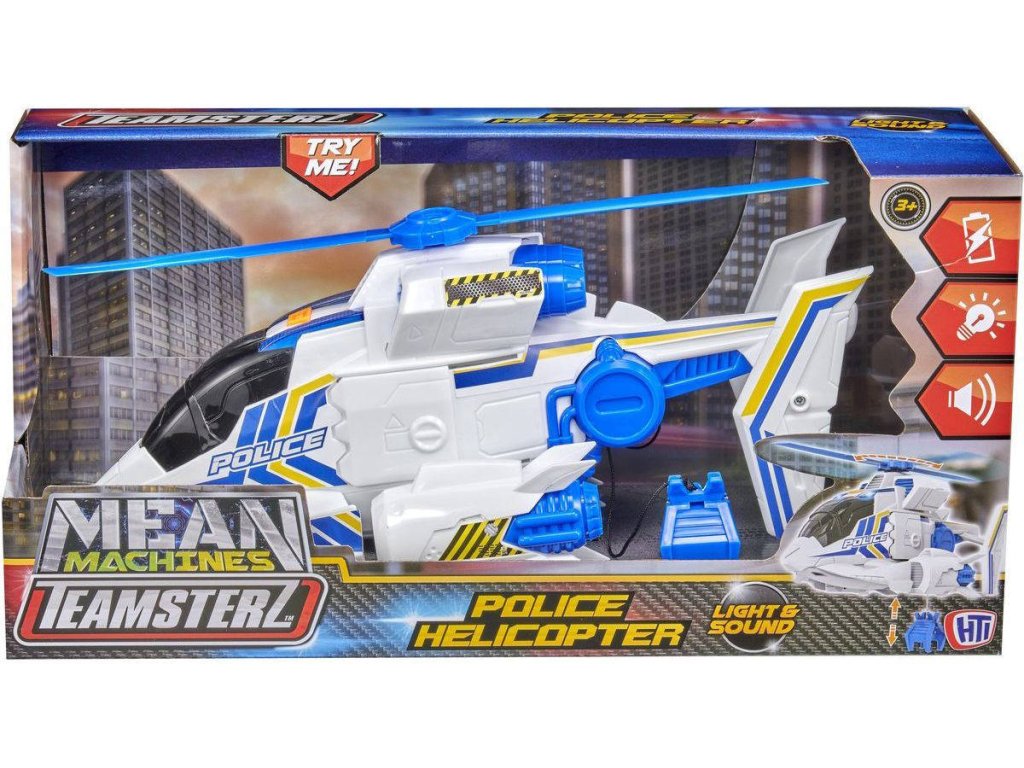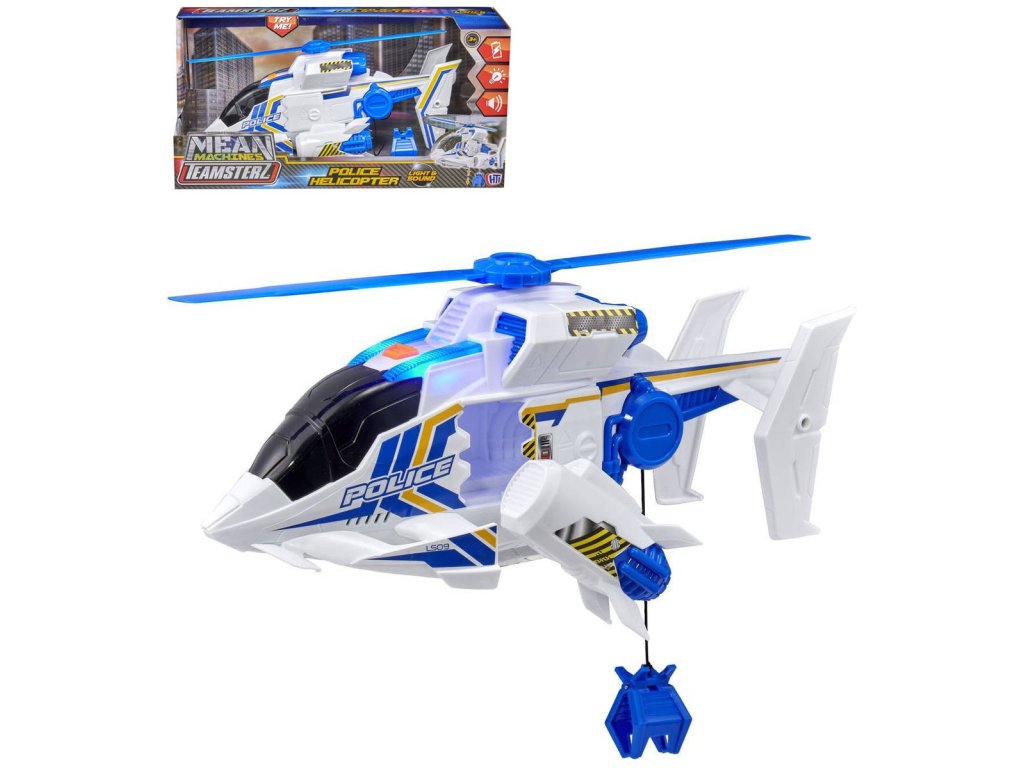Vzlétněte a vydejte se na svou vlastní záchrannou misi s policejním záchranným vrtulníkem Teamsterz. Modrá blikající světla, nouzové sirény, zvuky vrtulníku a futuristická hudba. Vrtulník má ruční naviják s hákem.