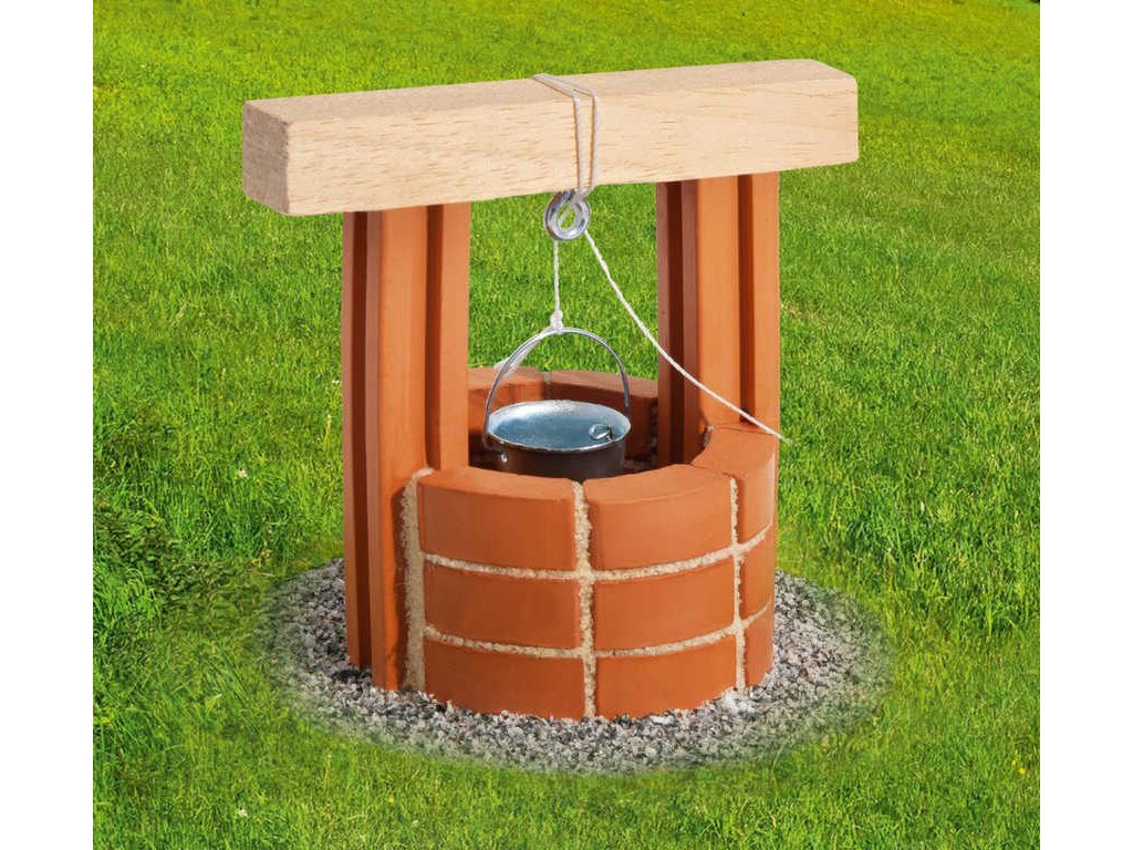 Stavebnice obsahuje: 28 prvků (cihly, kbelík, lano, dřevěný trám), cement, nářadí, grafický návod