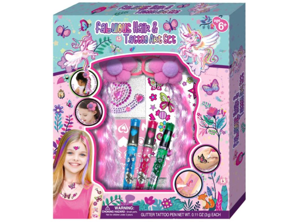 Úžasné tetovací studio, se kterým si vyzdobíš vlasy a tělo barevnými vzory i kamínky. Sada obsahuje tetování, ozdobu do vlasů, kamínky, šablony, barevná tetovací pera. Zažij spoustu zábavy a ozdob sebe i kamarády. Vhodné pro děti od 6ti let.