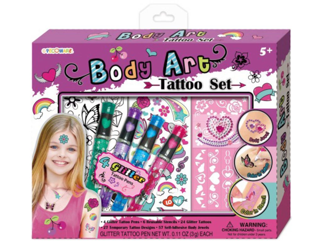 Sada obsahuje třpytivá tetování, kamínky, šablony a barevná tetovací pera.