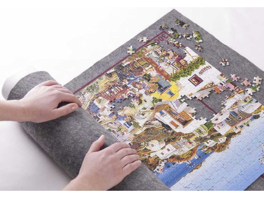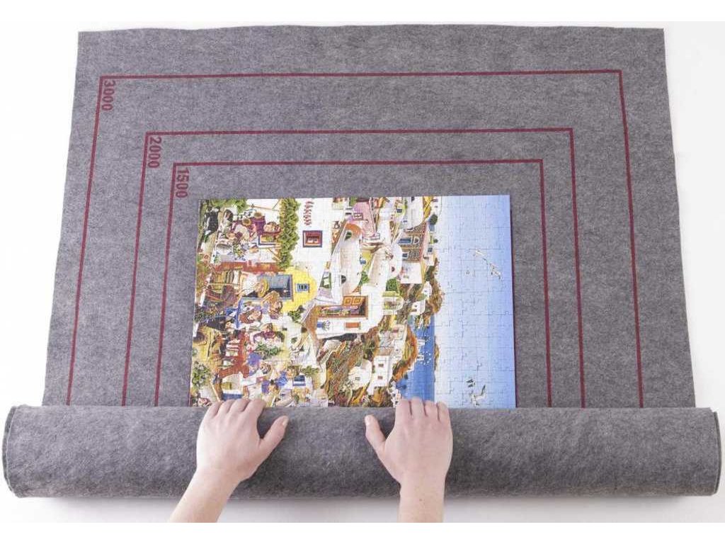 Podložka vhodná pro puzzle do velikosti 110 x 85cm (odpovídá 3.000 dílků většiny výrobců). Kobereček na puzzle je ideální pro úsporu místa a bezpečné uchování nedokončeného i hotového obrázku. Podložka zajistí bezpečné uchování nebo transport vašeho puzzle. Skládá se z pevných kartonových tubusů o průměru 10cm, které spojíte k sobě, šedé filcové podložky a pásků se suchým zipem na pevné uchycení. Na šedém koberečku jsou vyznačeny obrysy pro puzzle Trefl o velikosti 1000, 1500, 2000 a 3000 dílků.