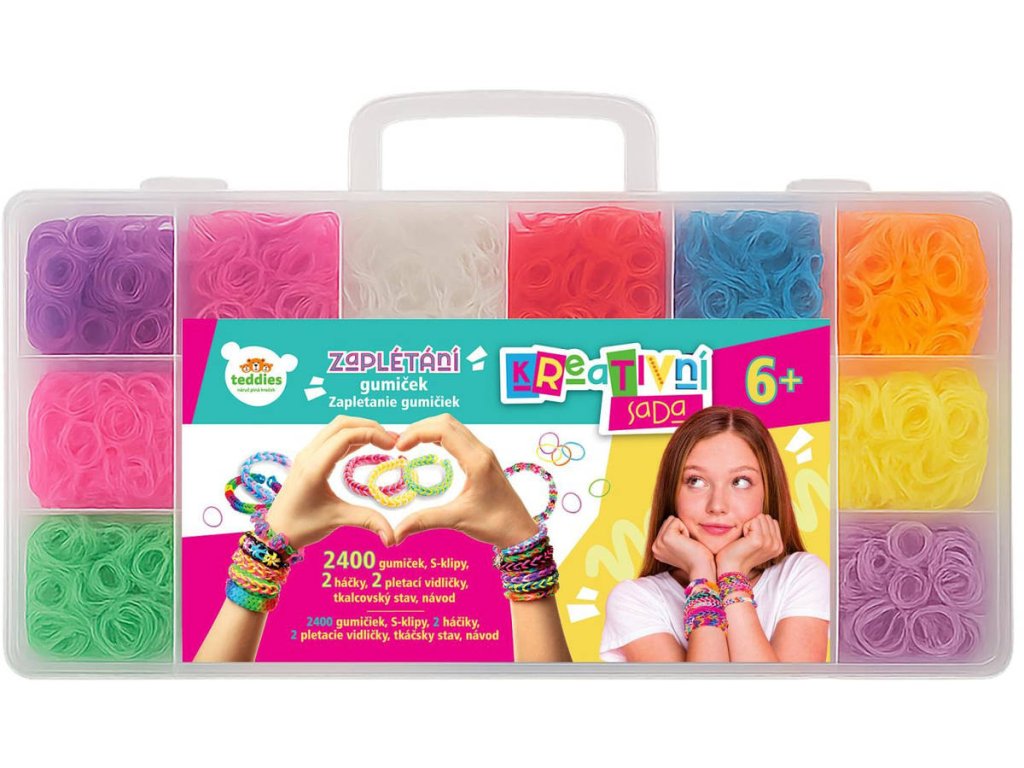Tyto barevné zaplétací gumičky budou jistě skvělou zábavou na několik hodin. Maxi balení v plastovém boxu s přihrádkami obsahuje 2400ks gumiček různých barev, pletací stav, svorky na zakončení a další doplňky. Zabavte a