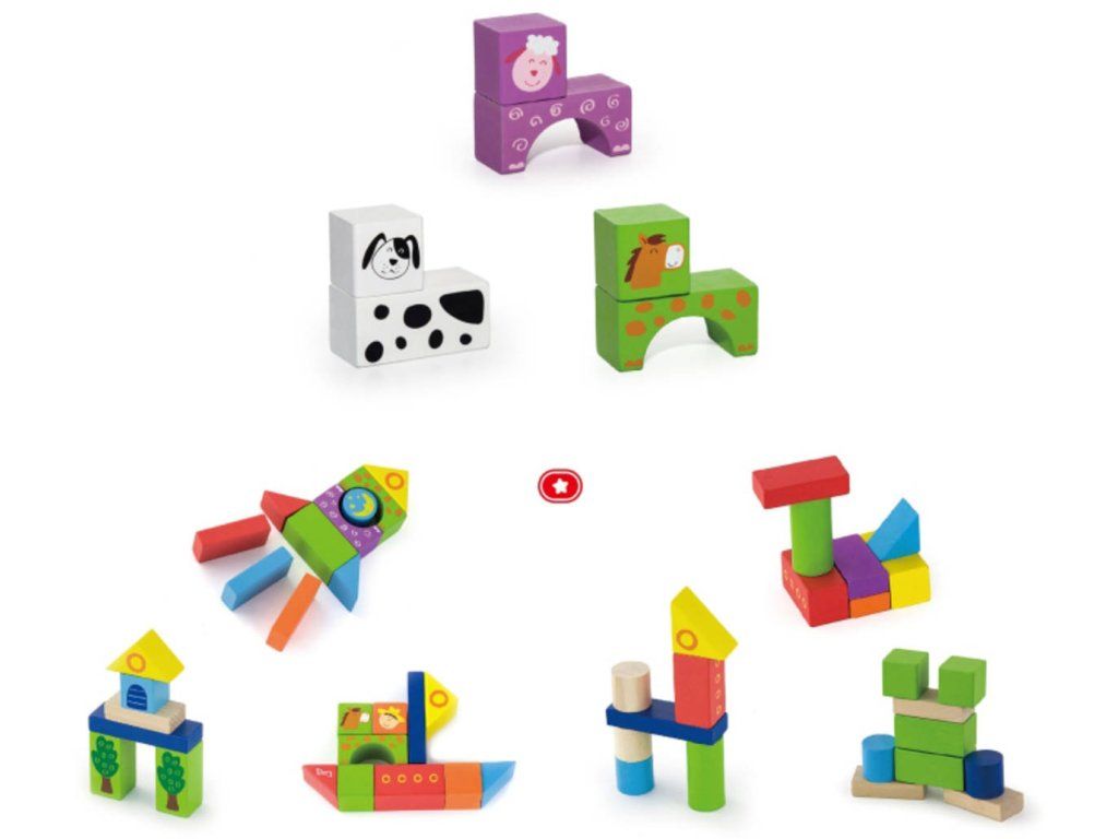 Kostky jsou snadno uchopitelné pro malé dětské ruce. Tyto pestrobarevné klasické dřevěné kostky podporují kreativitu a rozvíjejí základní motorické dovednosti. Stavebnice obsahuje kostky z přírodního dřeva, s ručně malovanými vzory. Tento set umožňuje dětem stavět cokoli, co si dokážou představit. Součástí sady je také leták s nápady na stavění. Sada je uložena v praktickém úložném válci s víkem a madlem pro snadné přenášení, takže je ideální i na hraní na cestách. Když se nepoužívají, lze kostky přehledně uklidit.