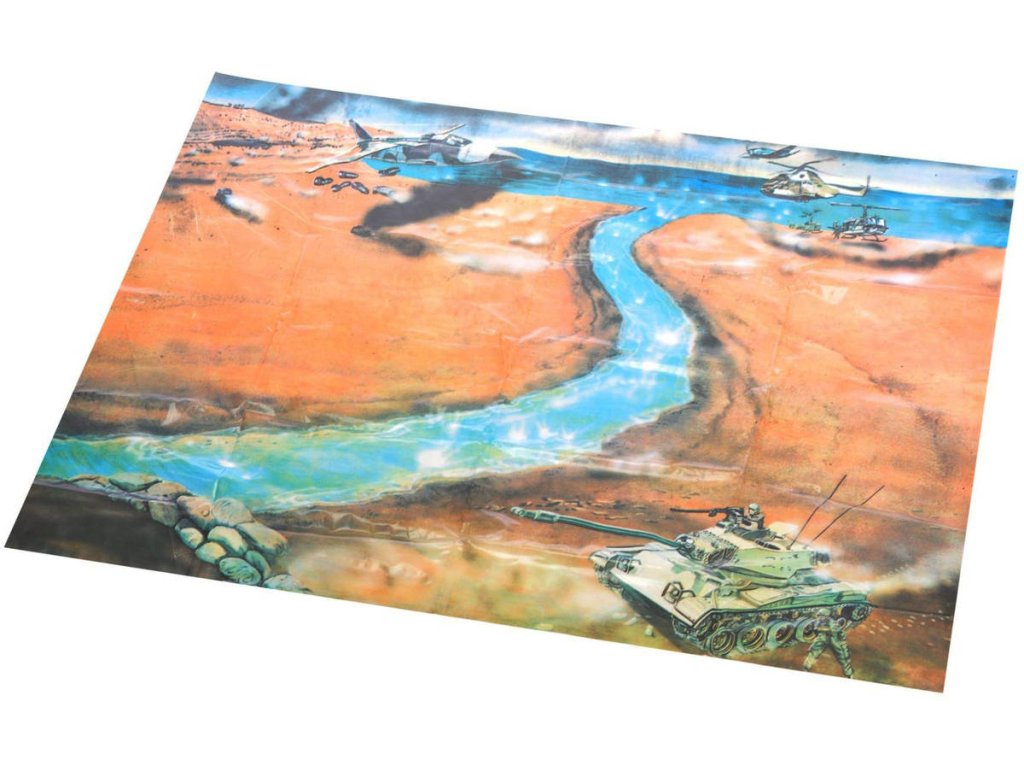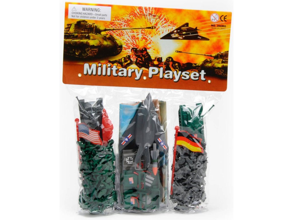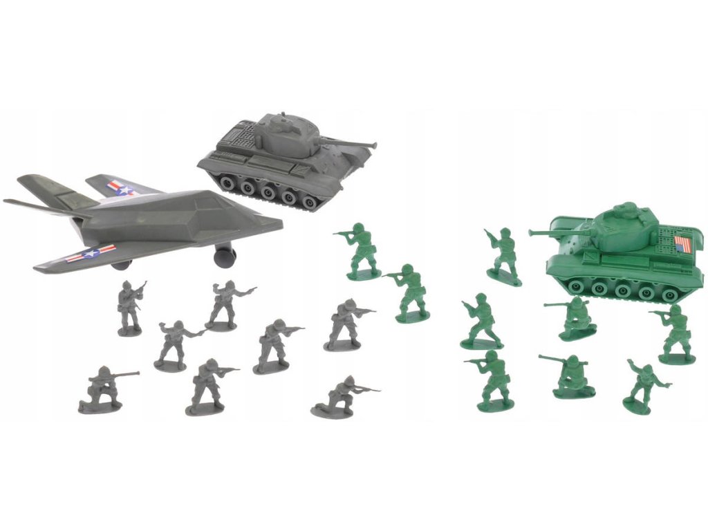 Plastový vojenský herní set. Součástí figurky vojáků (2 vojska - 2 barvy) v bojových pozicích, vojenská vozidla (tank, bojové letadlo, auto), tématické herní pozadí a prapory. 2 barevné varianty.