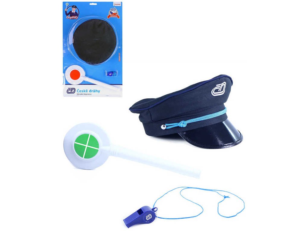 Výpravčí České Dráhy set čepice s plácačkou a píšťalkou na kartě