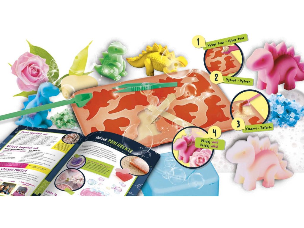 Kreativní sada pro děti, která umožňuje vyrobit vlastní barevná a voňavá mýdla s motivy dinosaurů. Díky přiloženým formičkám a glycerinovým vločkám si děti snadno vytvoří originální mýdla ve tvaru pravěkých zvířátek a zároveň rozvíjejí svou kreativitu a jemnou motoriku.