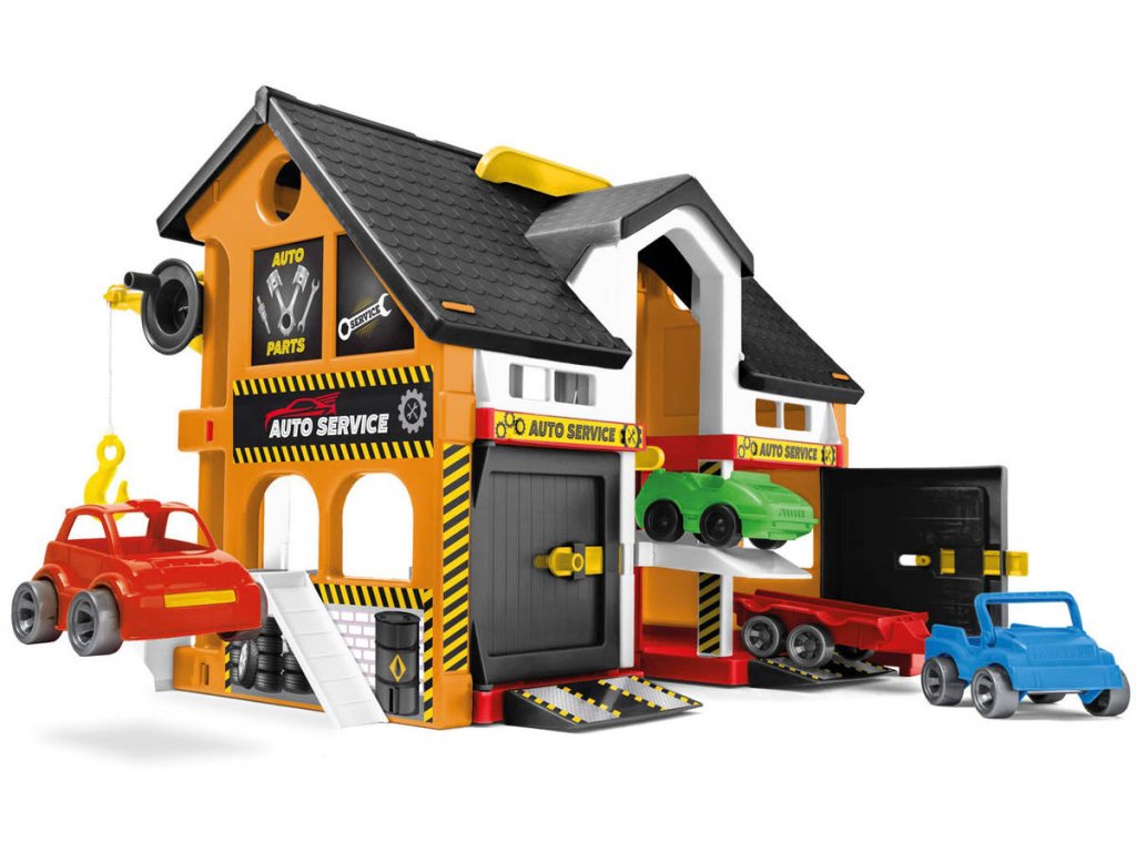 Zahraj si na auto mechanika díky tomuto dvojpodlažnímu servisu, který zabaví každého malého milovníka aut. K využití jsou dva servisní stojany, rampy či výtahy. Dveře dílny je možné otevírat. Součástí balení jsou i 3 auta, 3 kontejnery a nálepky. Dům má na střeše rukojeť, díky které ho můžeš kamkoliv přemístit.
