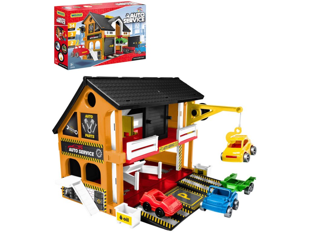 WADER Autoservis 2 patra s výtahem herní set se 3 auty a doplňky plast
