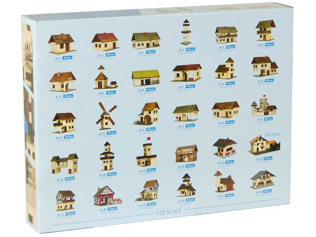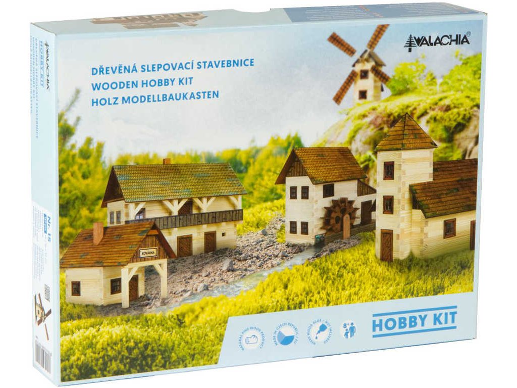 Dřevěná slepovací stavebnice obsahuje dřevěné hranolky daných délek ke stavbě roubených stěn, díly na střechy a štíty, kartonové výseky oken a dveří i předtištěné papírové potisky. Součástí