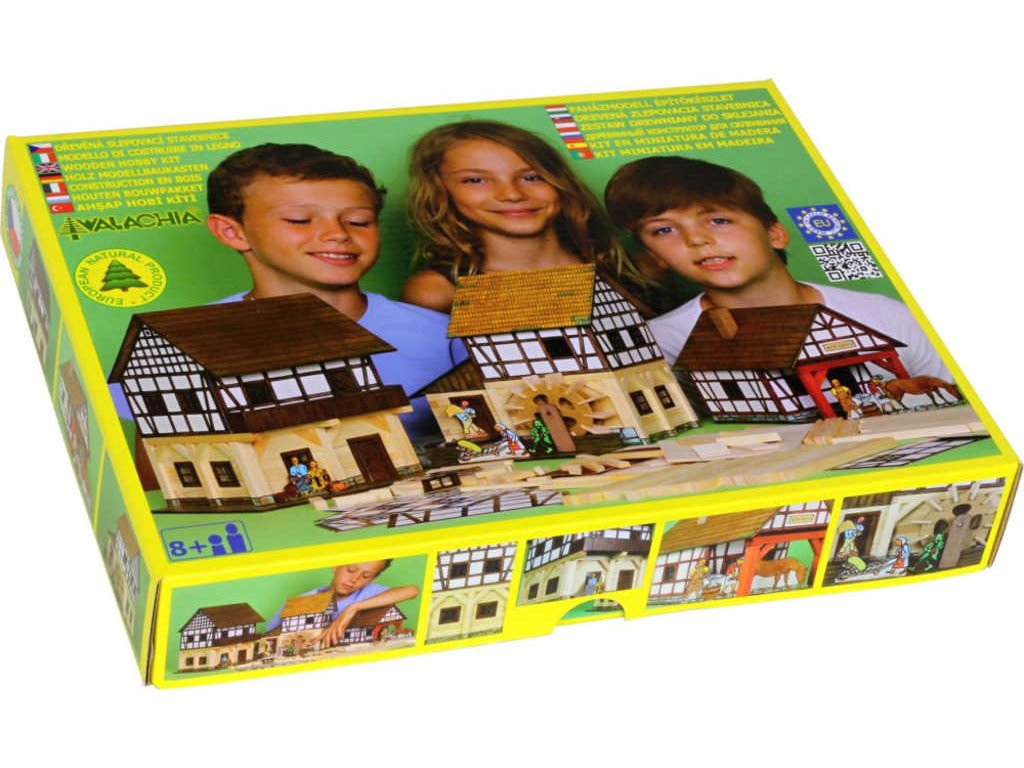 Dřevěná slepovací stavebnice obsahuje dřevěné hranolky daných délek ke stavbě roubených stěn, díly na střechy a štíty, kartonové výseky oken a dveří i předtištěné papírové potisky. Součástí stavebnice je