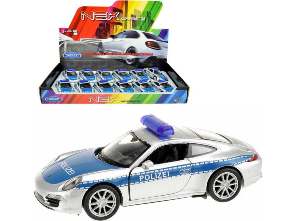 WELLY PORSCHE 911 (991) CARRERA S: Krásný věrný kovový model (detailní kopie) - policejní auto z kovu, s pohonem na zpětné natažení. Má otevírací dveře (dvířka jdou otevírat). Vůz vyroben tlakovým litím z kovové slitiny v kombinaci s plastovými díly.
