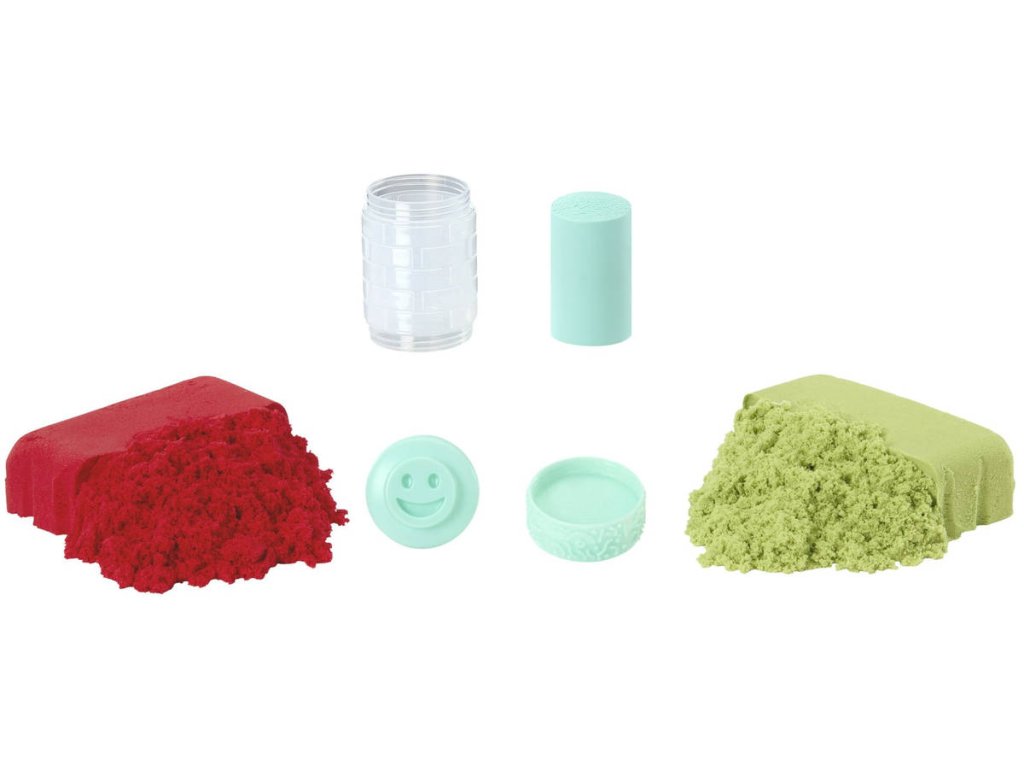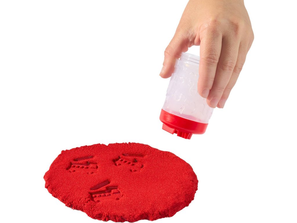Balení obsahuje kinetický písek 907g, plastelínu 71 g, razítka a tubu, která slouží jako váleček.